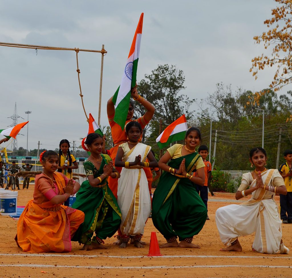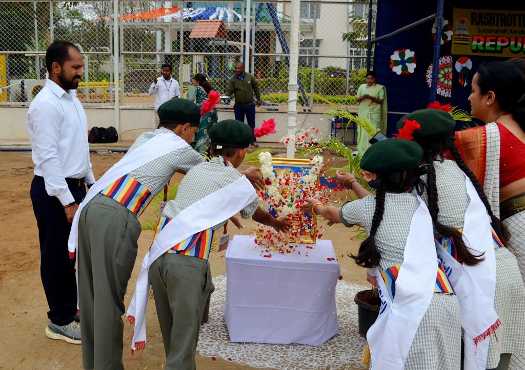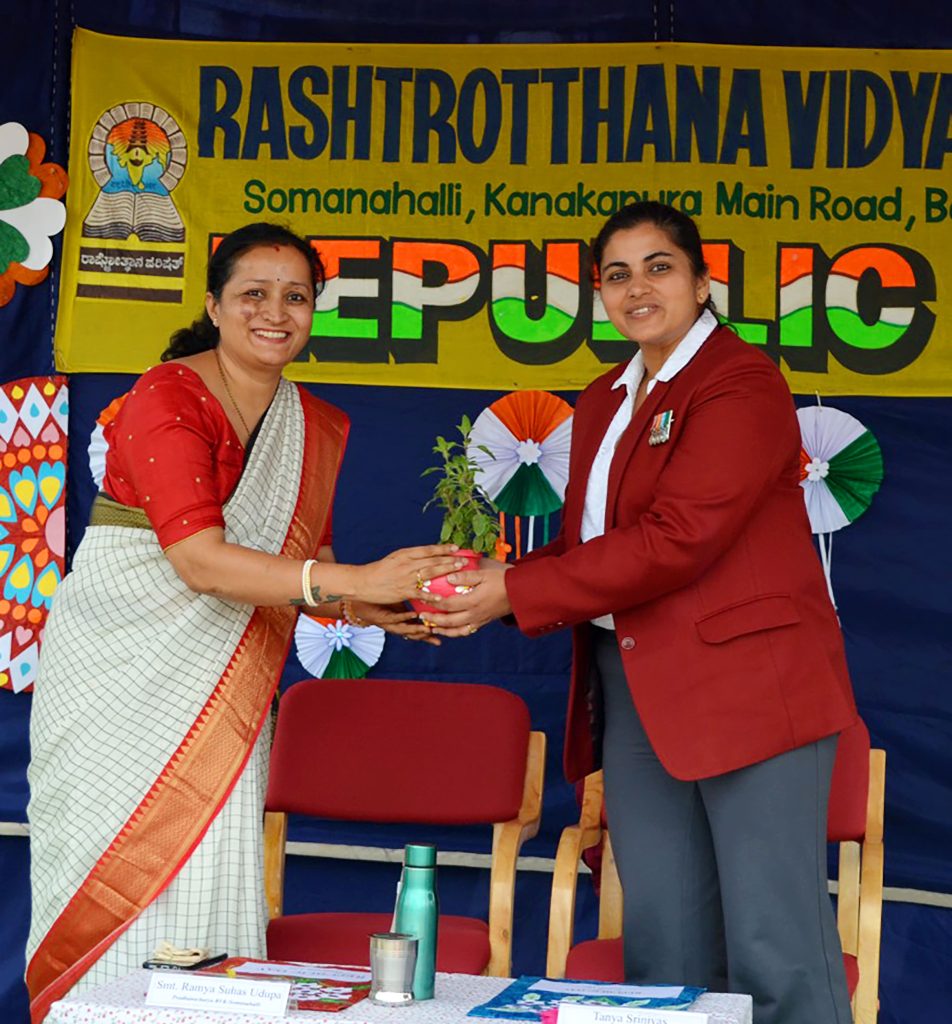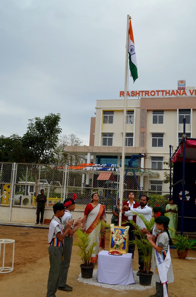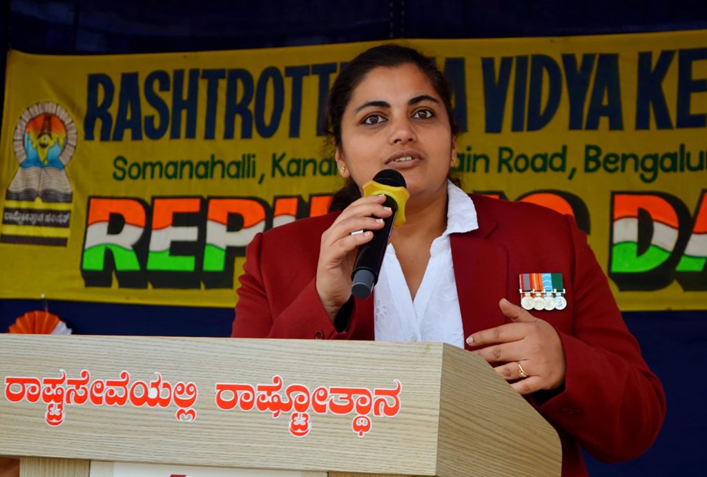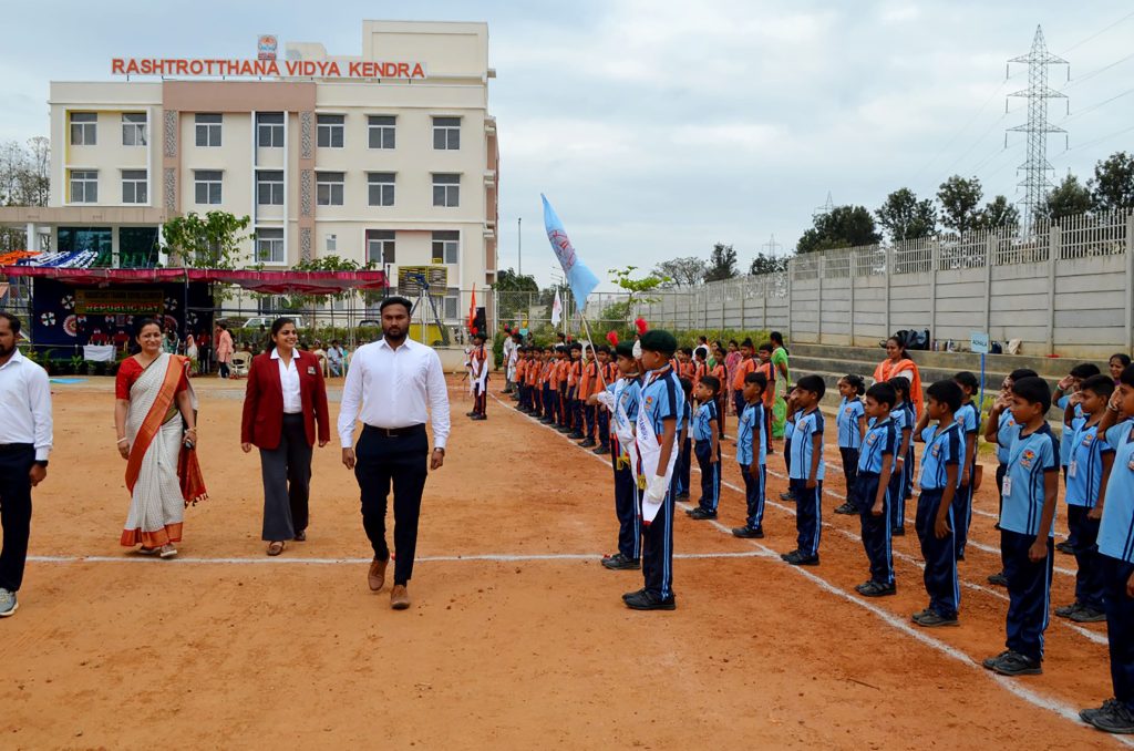 Bengaluru, Jan. 26: The 77th Republic Day was celebrated herein Rashtrotthana Vidya Kendra – Somanahalli. The Chief Guest, VG Commander Tanya Srinivas (Retd.) hoisted the National Flag. The students performed a disciplined parade, impressive stunts and a vibrant patriotic dance that showcased unity, courage and love for the nation. The Chief Guest addressed the gathering and inspired the students with his words on discipline, responsibility and service to the country.