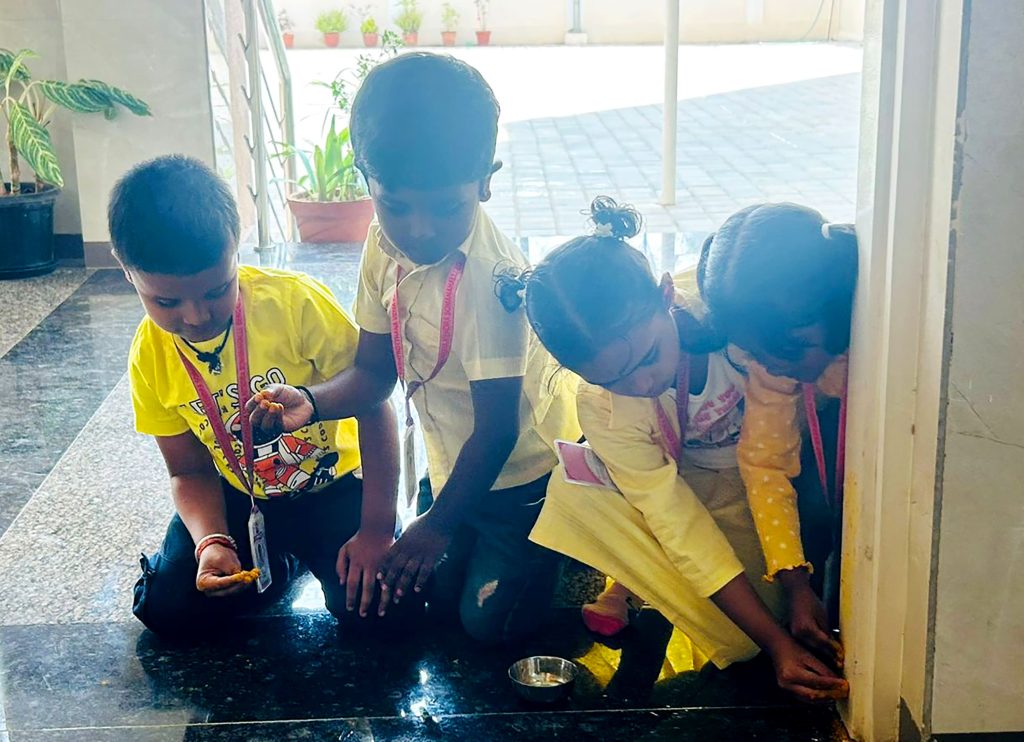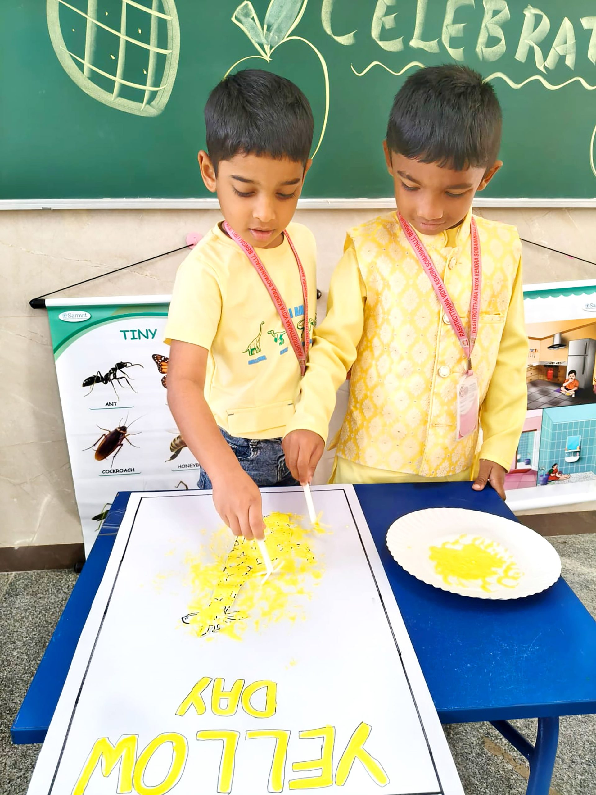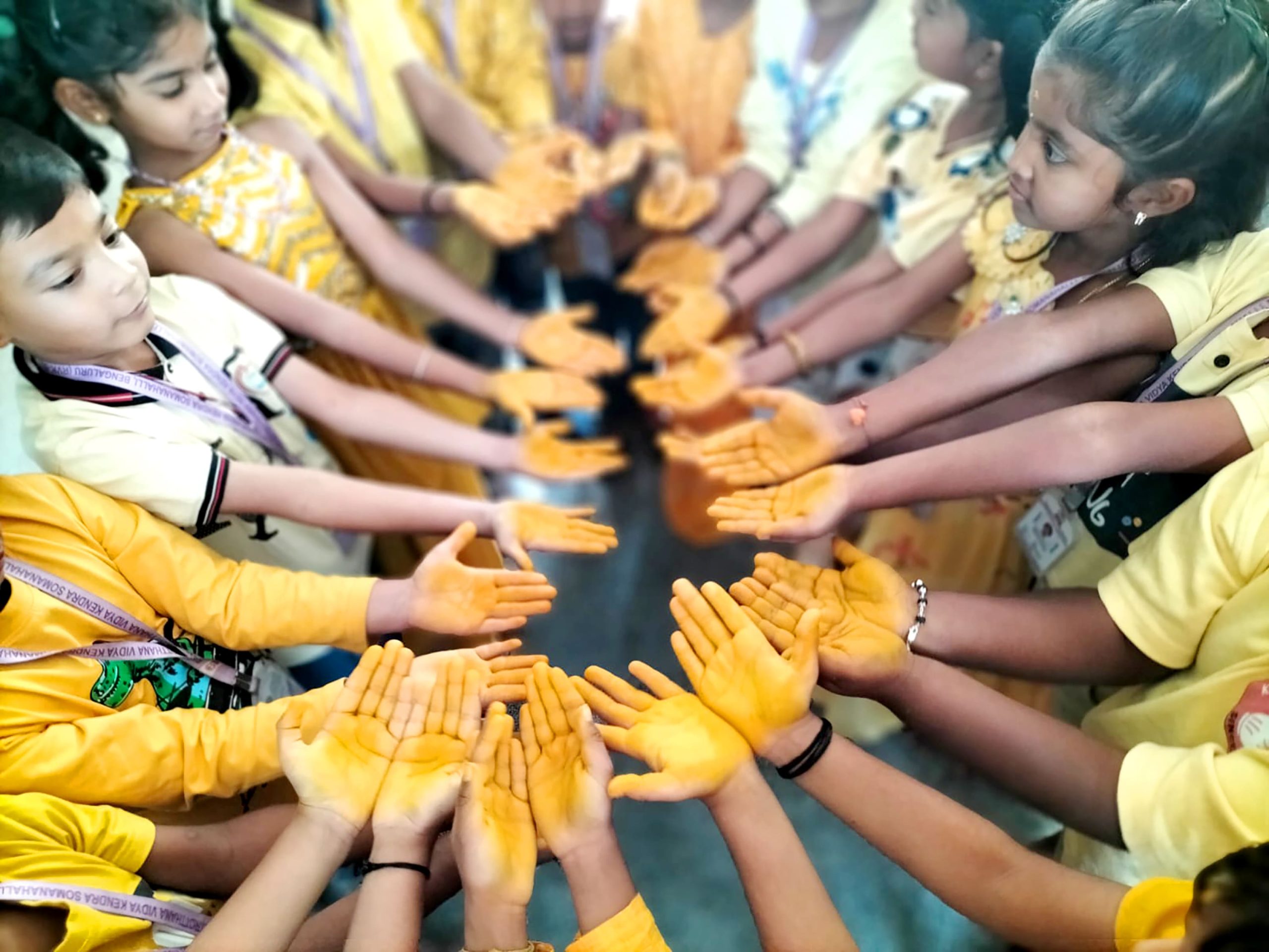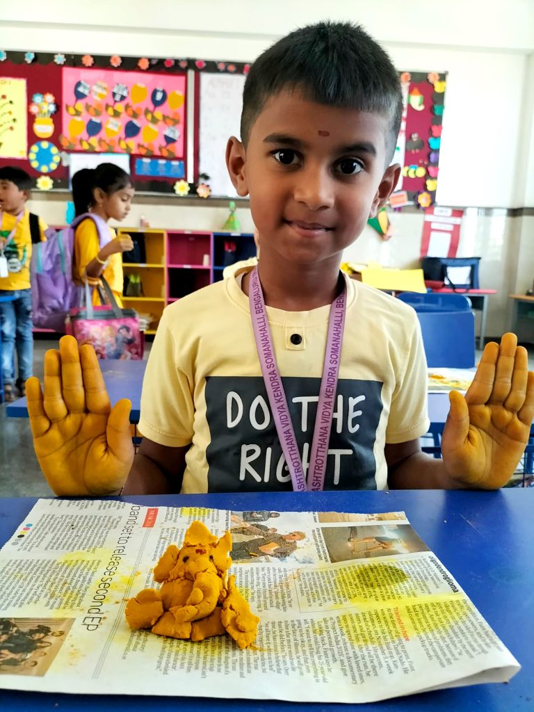 Bengaluru, Feb. 3: Yellow Day was celebrated herein Rashtrotthana Vidya Kendra – Somanahalli. The program started with a group activity inside the classroom. The importance of Yellow Day was explained. Children recited shlokas. A short film of sunflower seed sprouting was shown. Various activities were performed such as rubbing Raw Turmeric and making geometric shapes and making Ganesha, Gauri and other creative figures using turmeric. The program concluded with the worship of the host and the worship of turmeric with devotion.