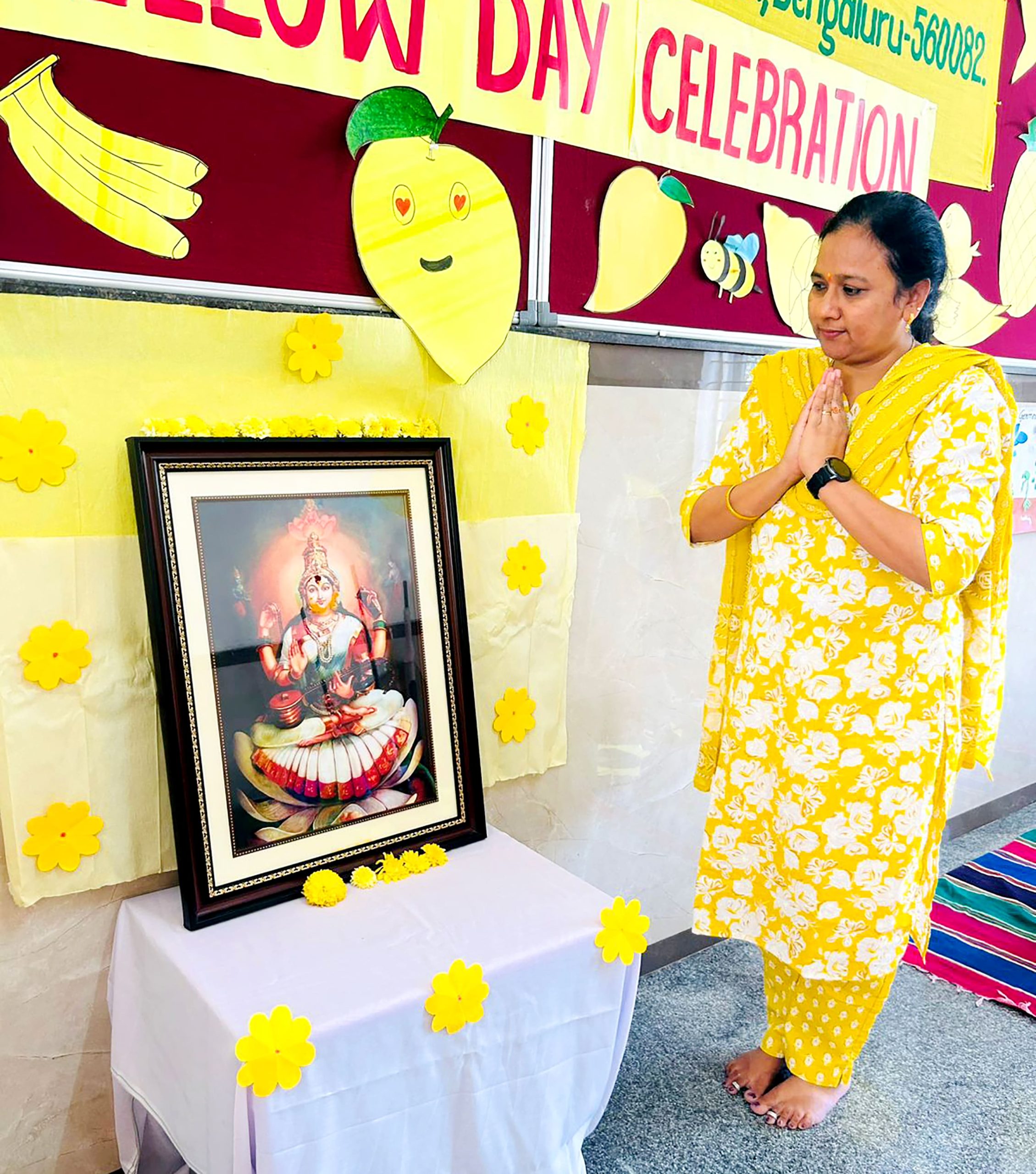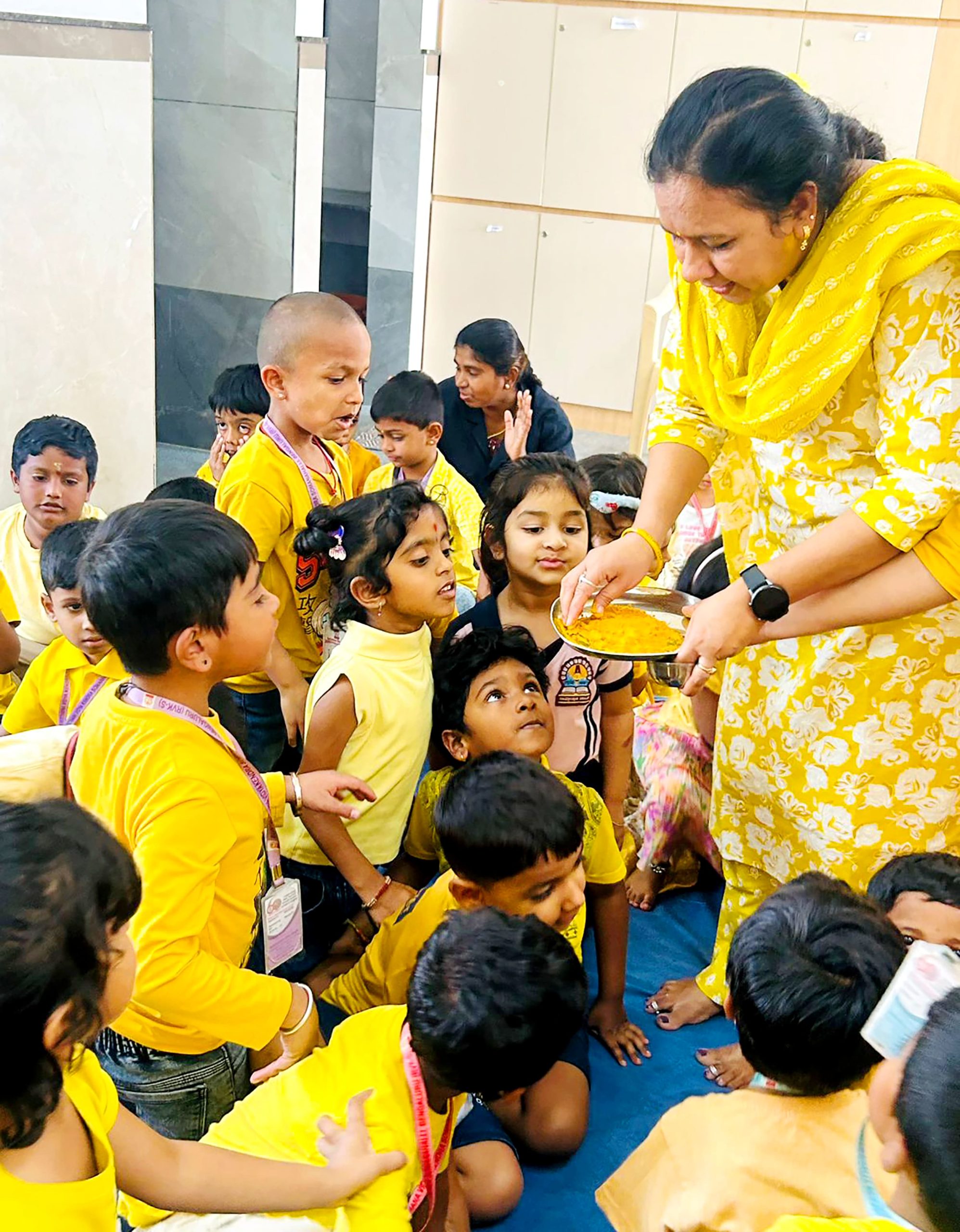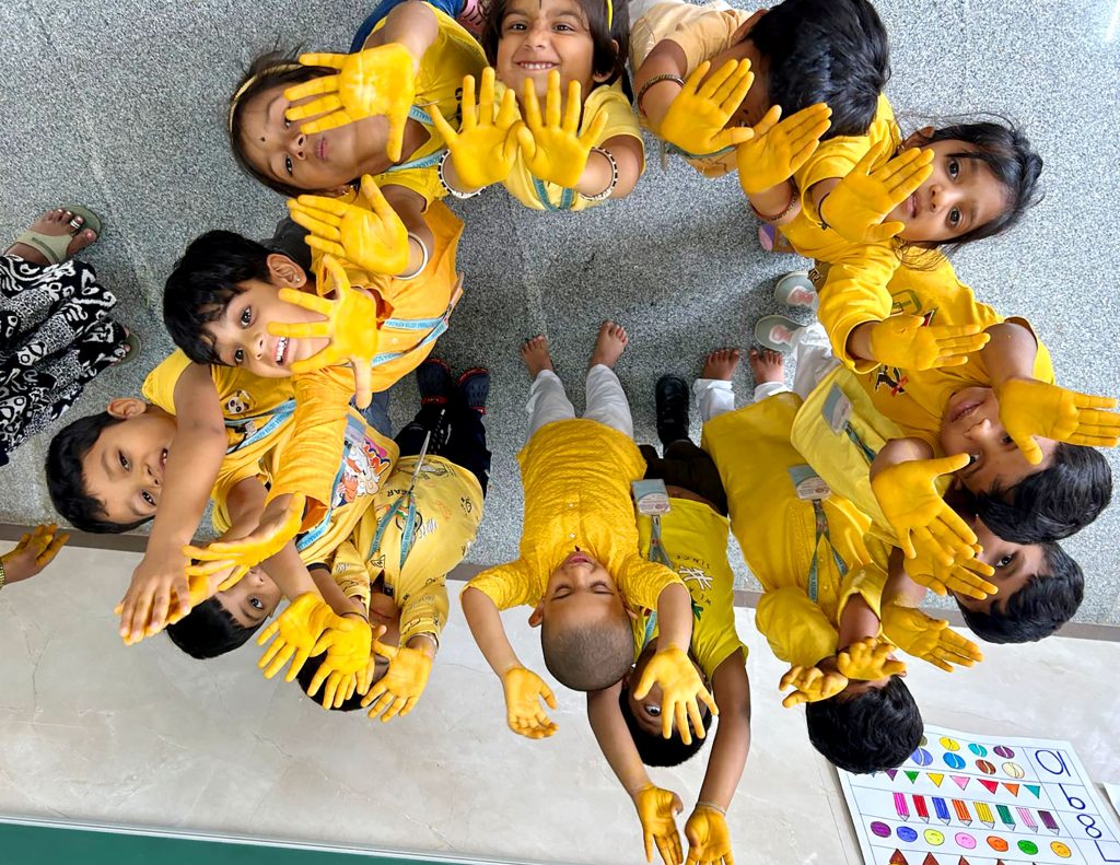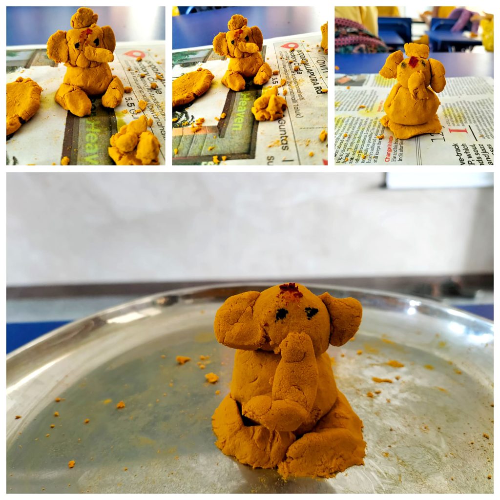 Bengaluru, Feb. 3: Yellow Day was celebrated herein Rashtrotthana Vidya Kendra – Somanahalli. The program started with a group activity inside the classroom. The importance of Yellow Day was explained. Children recited shlokas. A short film of sunflower seed sprouting was shown. Various activities were performed such as rubbing Raw Turmeric and making geometric shapes and making Ganesha, Gauri and other creative figures using turmeric. The program concluded with the worship of the host and the worship of turmeric with devotion.