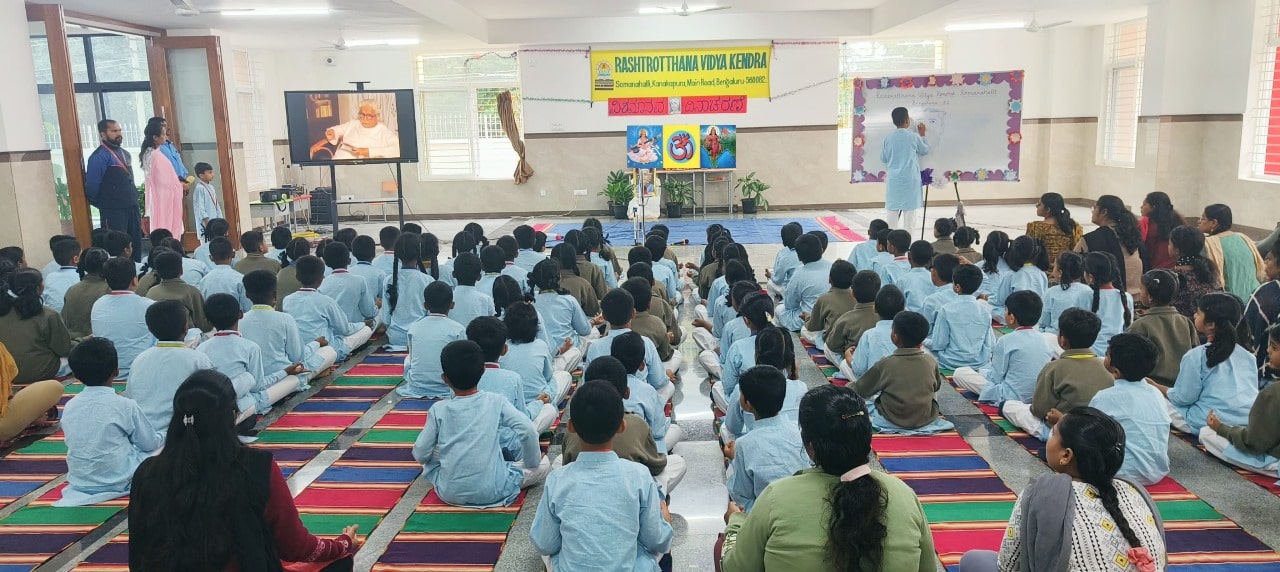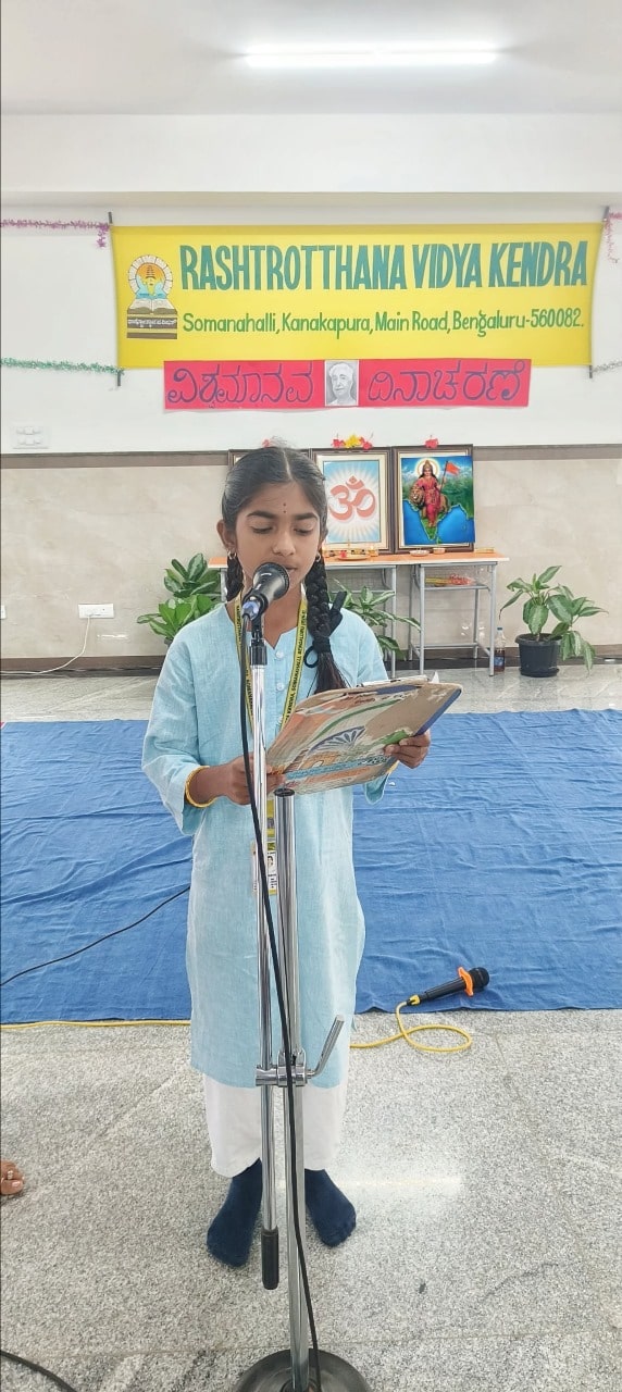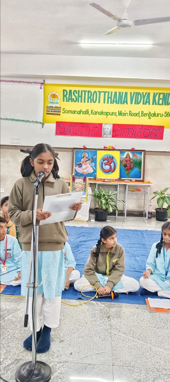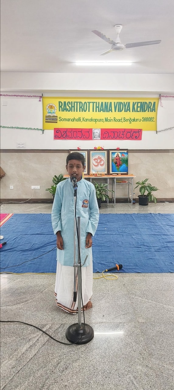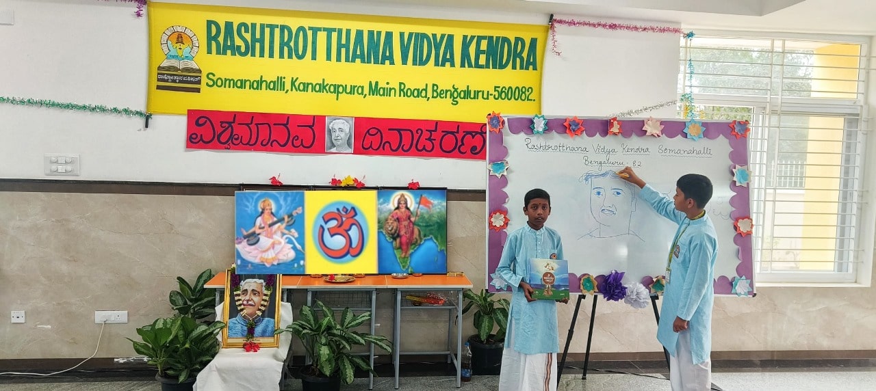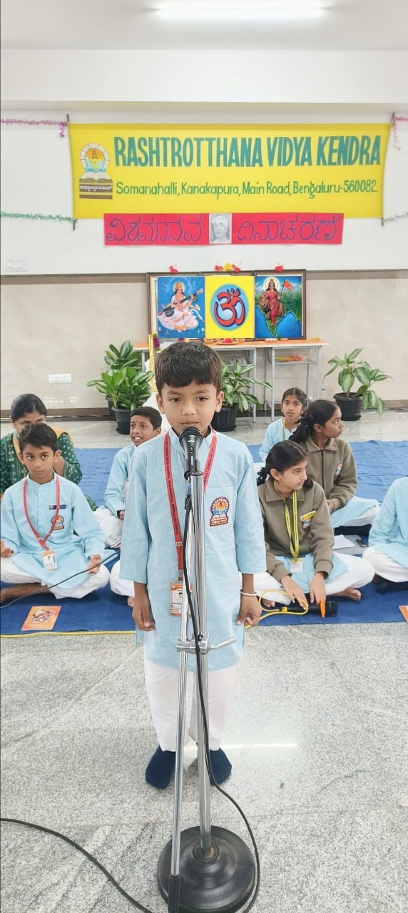 Bengaluru, Dec. 28: A World Human Day program was held herein Rashtrotthana Vidya Kendra – Somanahalli on the occasion of the birthday of National Poet, Dramatist, Jnanpith awardee and universal message of humanity Kuvempu. Student Dyuthi composed a poem about Kuvempu and presented it. Student Mithun disguised himself as poet Kuvempu and conveyed universal message and convinced about the biography of poet Kuvempu. Later, on the occasion of World Human Day, sixth grade Jatin drew a portrait of National Poet Kuvempu and created more awareness about poet Kuvempu among the children. Finally, a visual display was shown to provide more information about the National Poet.