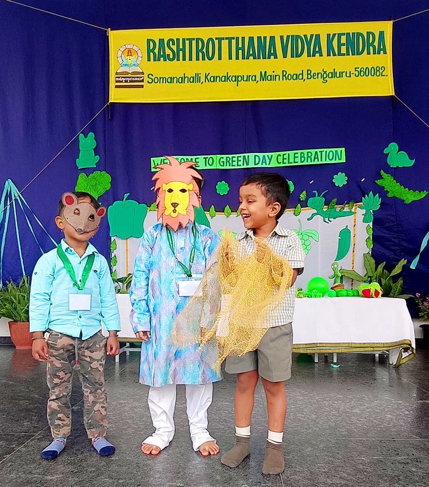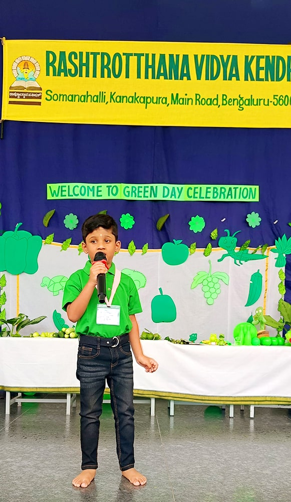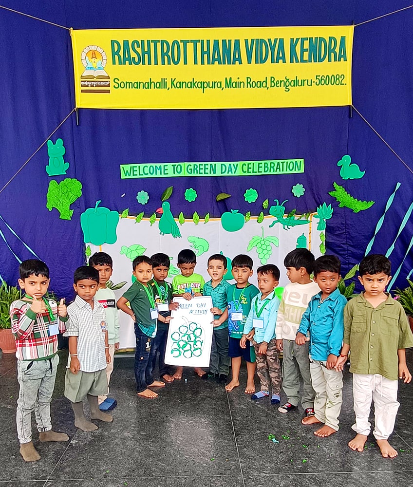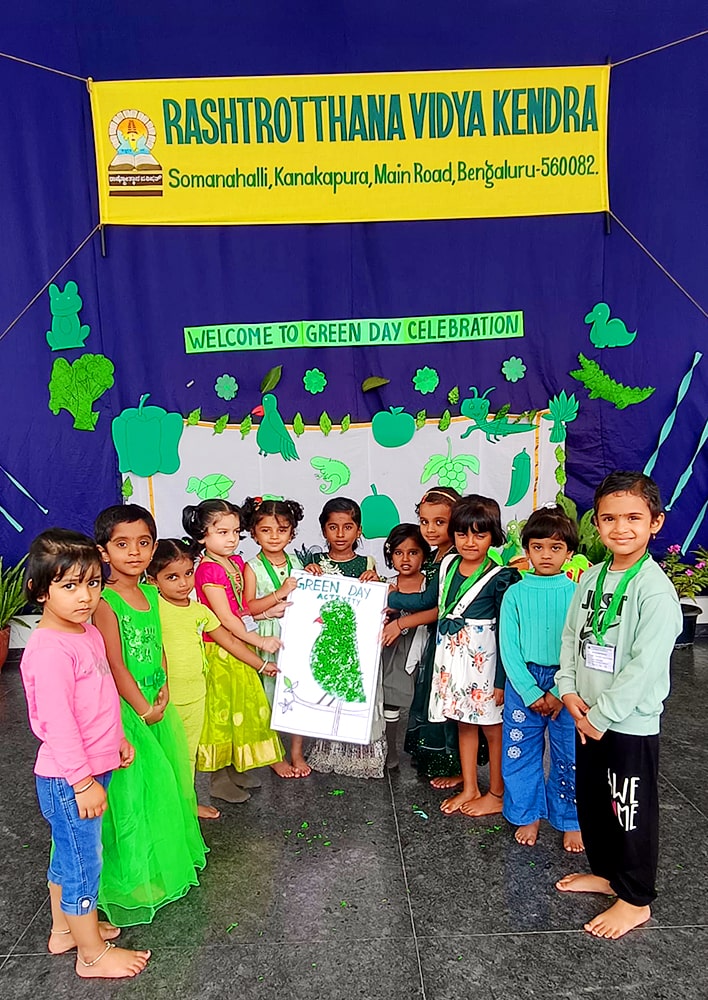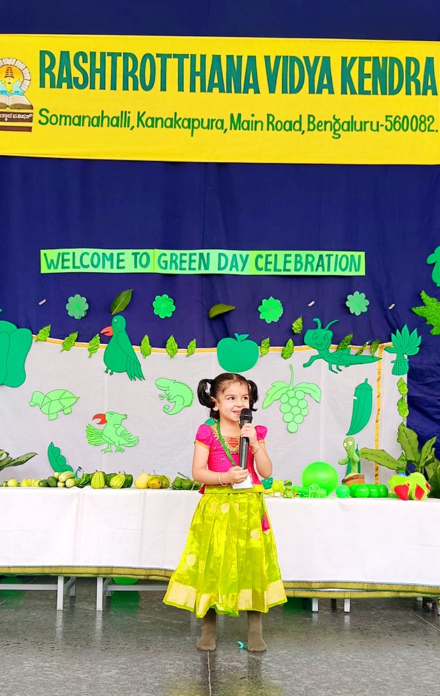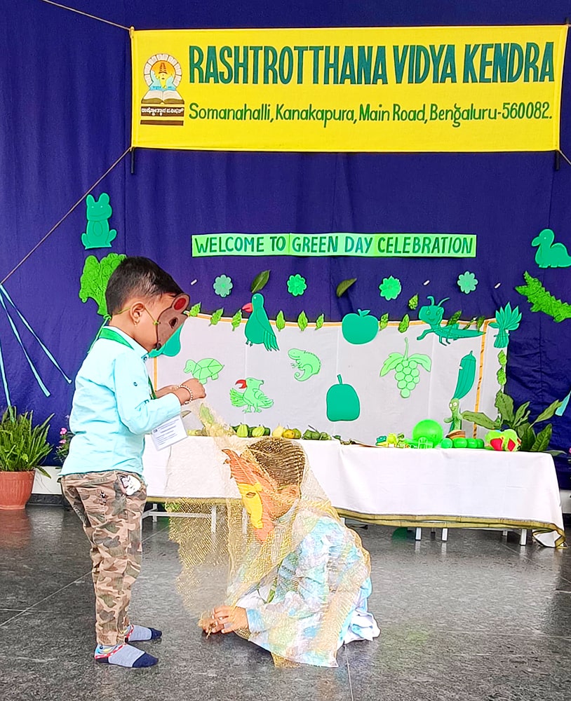 Bengaluru, June 26: Green Day was celebrated under the theme ‘A Journey to Green Forest Paradise’ herein Rashtrotthana Vidya Kendra – Somanahalli Gokulam section. Children and teachers came dressed in various shades of green.Pre-KG children recited shlokas. Children performed a fun skit on the lion and mouse. Children performed a dance. They tried to understand the nature around them. They explored the importance of trees, green vegetables and fruits in maintaining our health.Activities such as identifying various green vegetables and fruits and knowing their nutritional values were conducted.