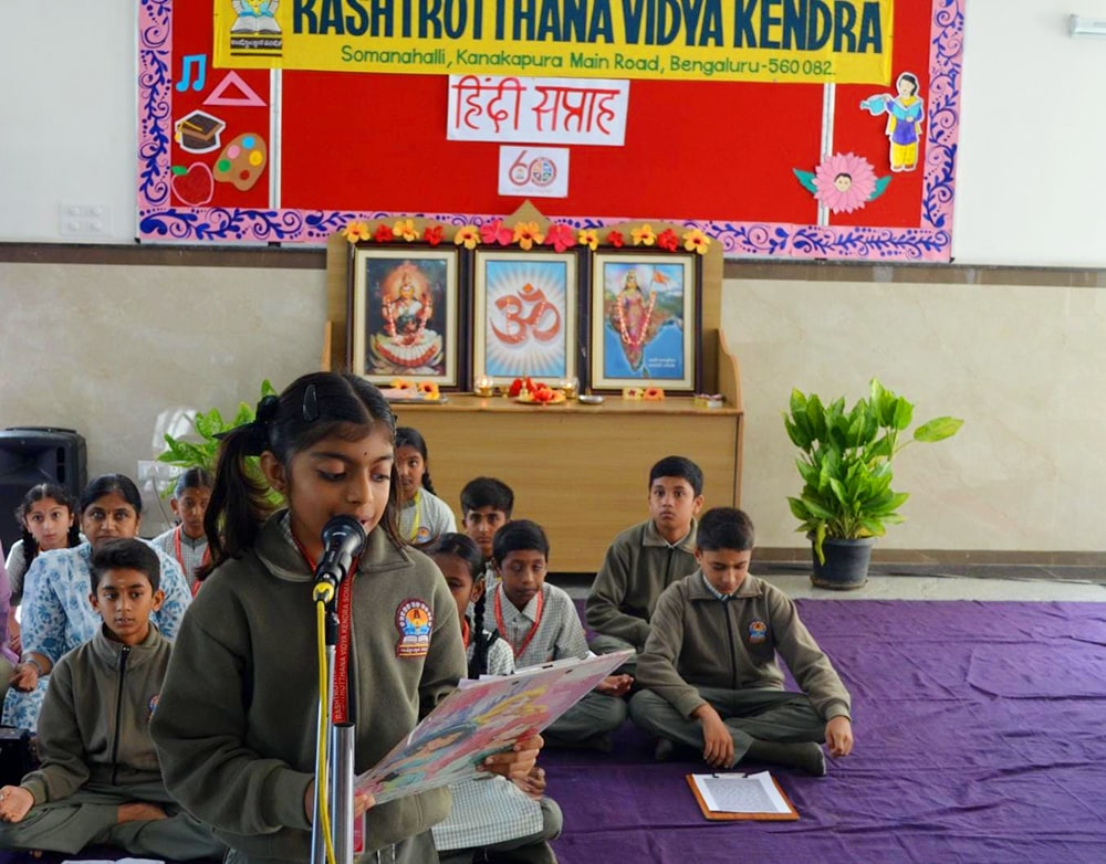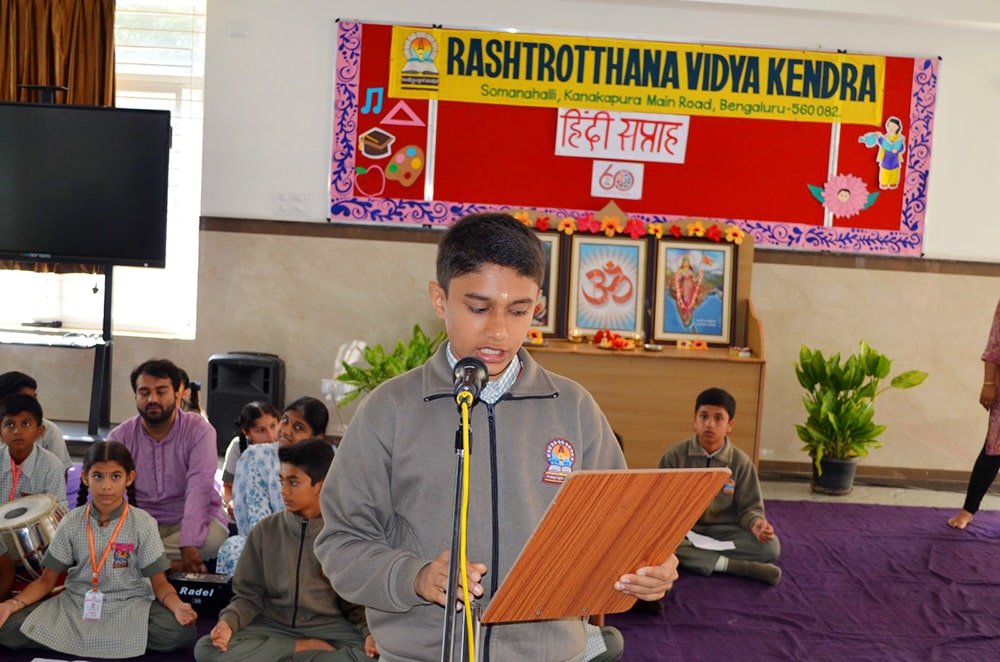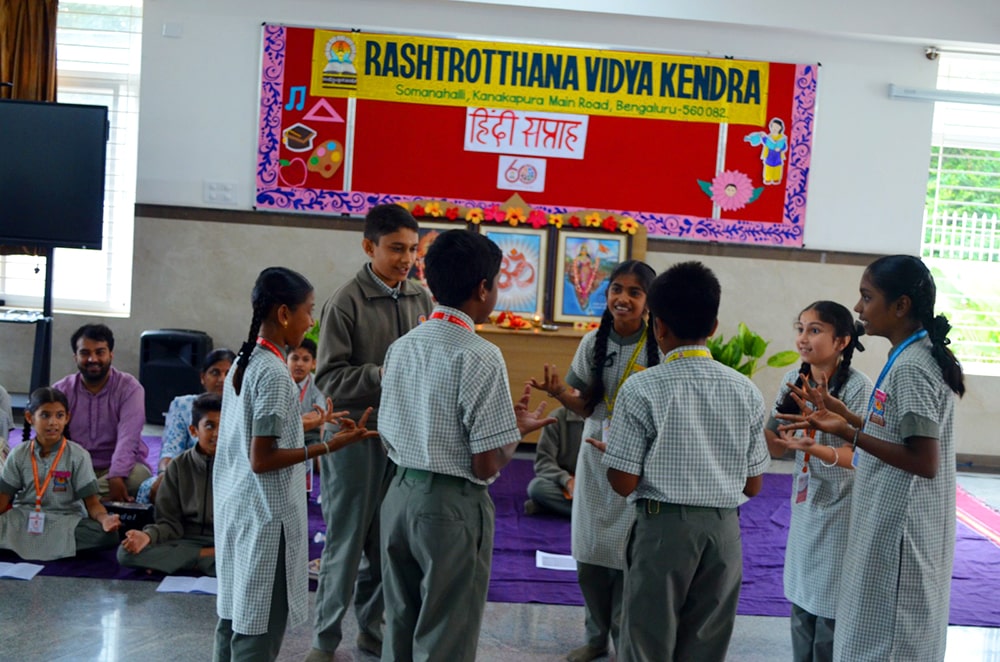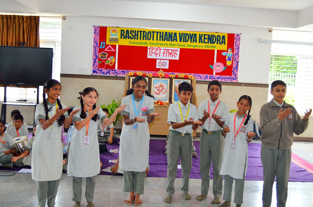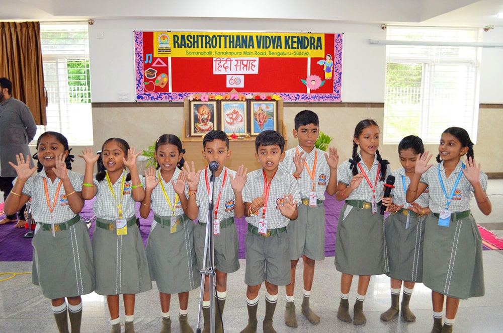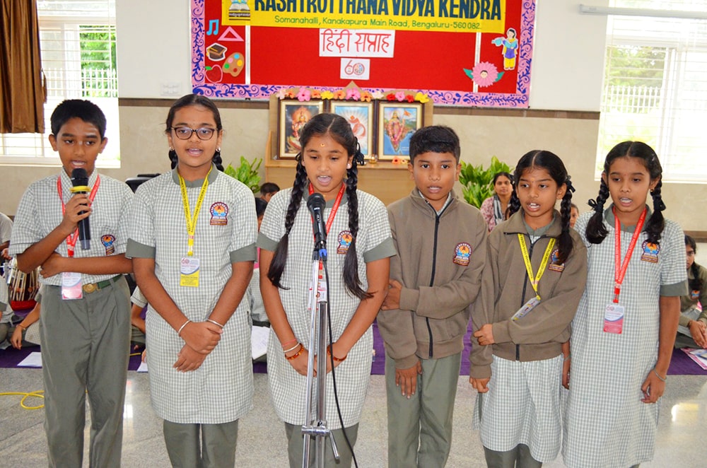 Bengaluru, Septt. 8-12: Hindi Week was celebrated herein Rashtrotthana Vidya Kendra – Somanahalli. During these five days, the students showcased their interest in learning Hindi through songs, dance, jokes, skits, quiz competitions, news reading, picture drawing and poems etc. As part of this celebration, Hindi Diwas was celebrated on 12/09/2025, with programs highlighting the significance of the day with dances and slogans.