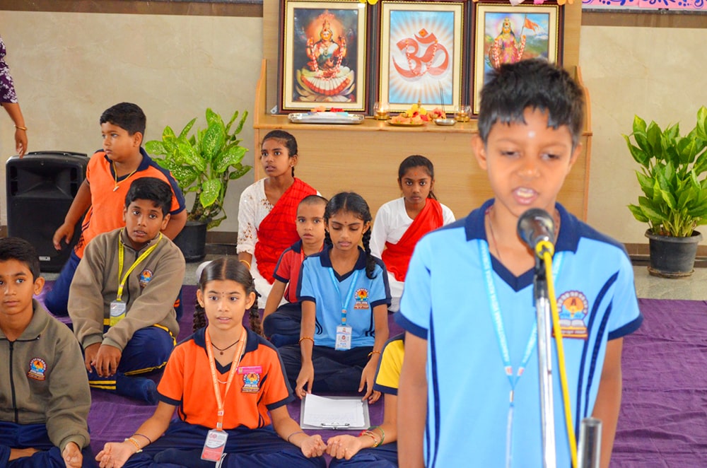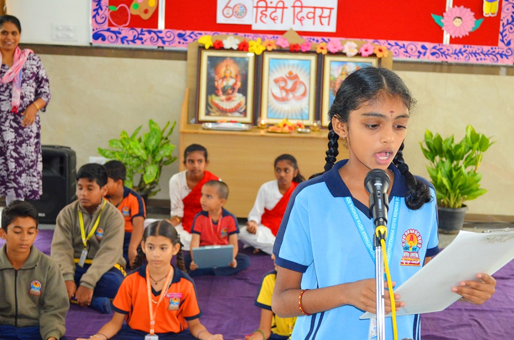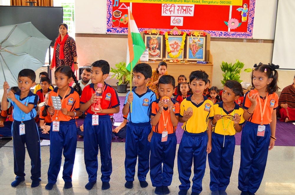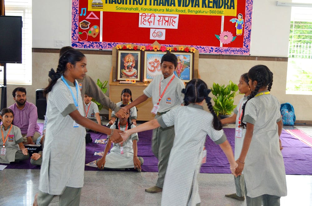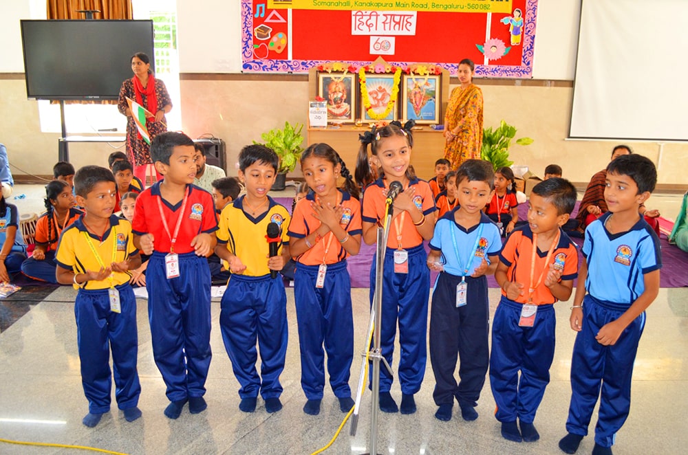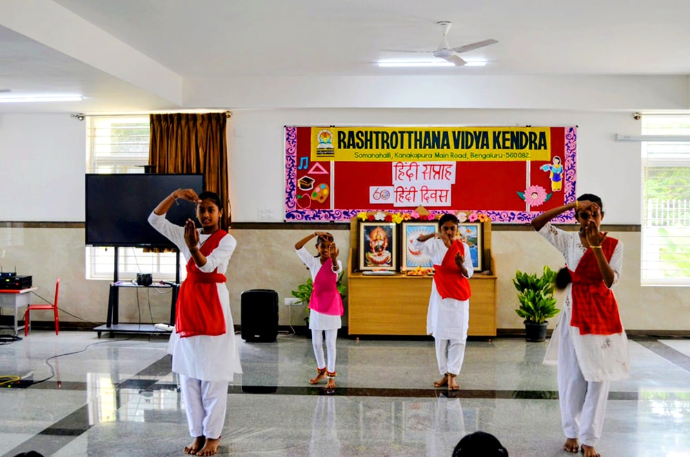 Bengaluru, Septt. 8-12: Hindi Week was celebrated herein Rashtrotthana Vidya Kendra – Somanahalli. During these five days, the students showcased their interest in learning Hindi through songs, dance, jokes, skits, quiz competitions, news reading, picture drawing and poems etc. As part of this celebration, Hindi Diwas was celebrated on 12/09/2025, with programs highlighting the significance of the day with dances and slogans.