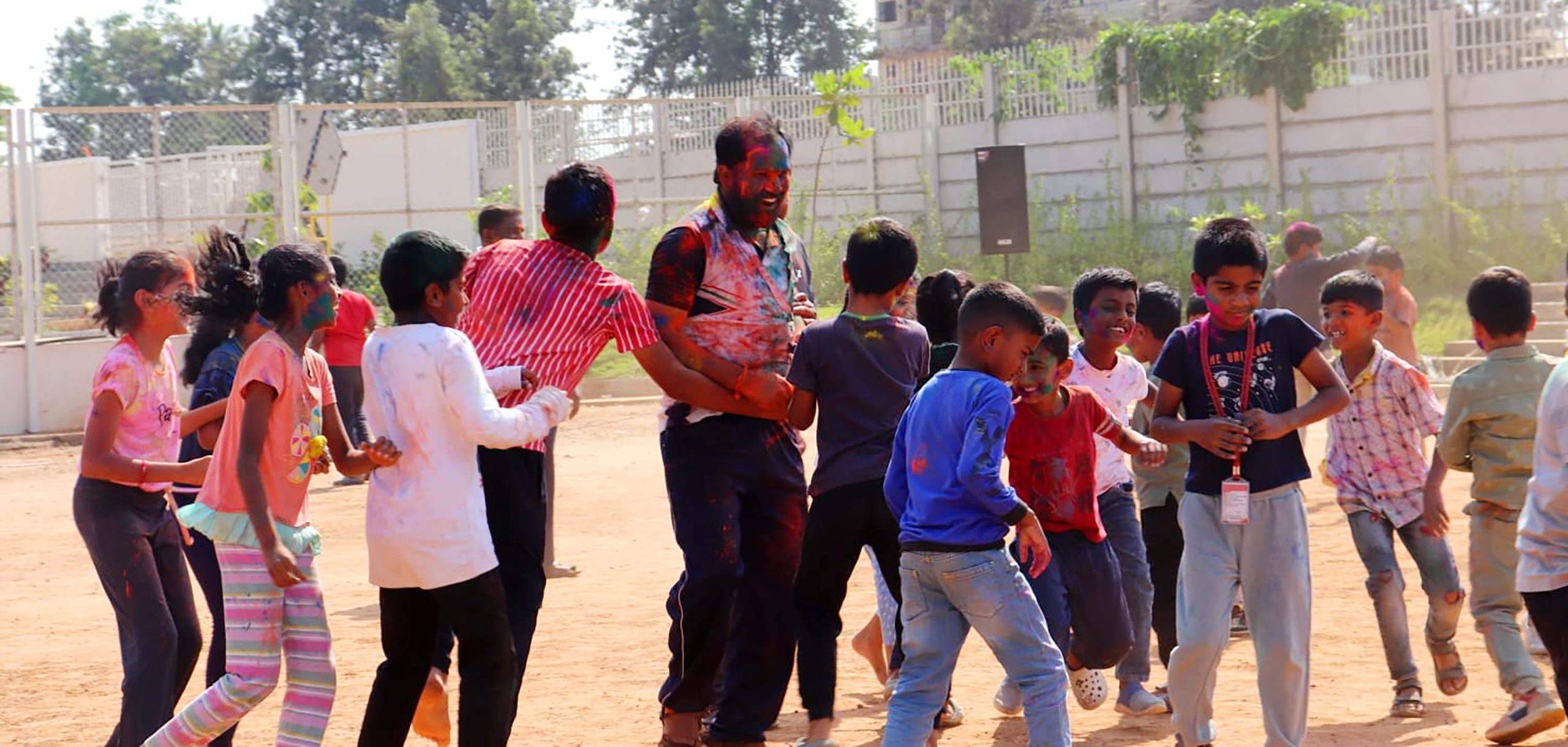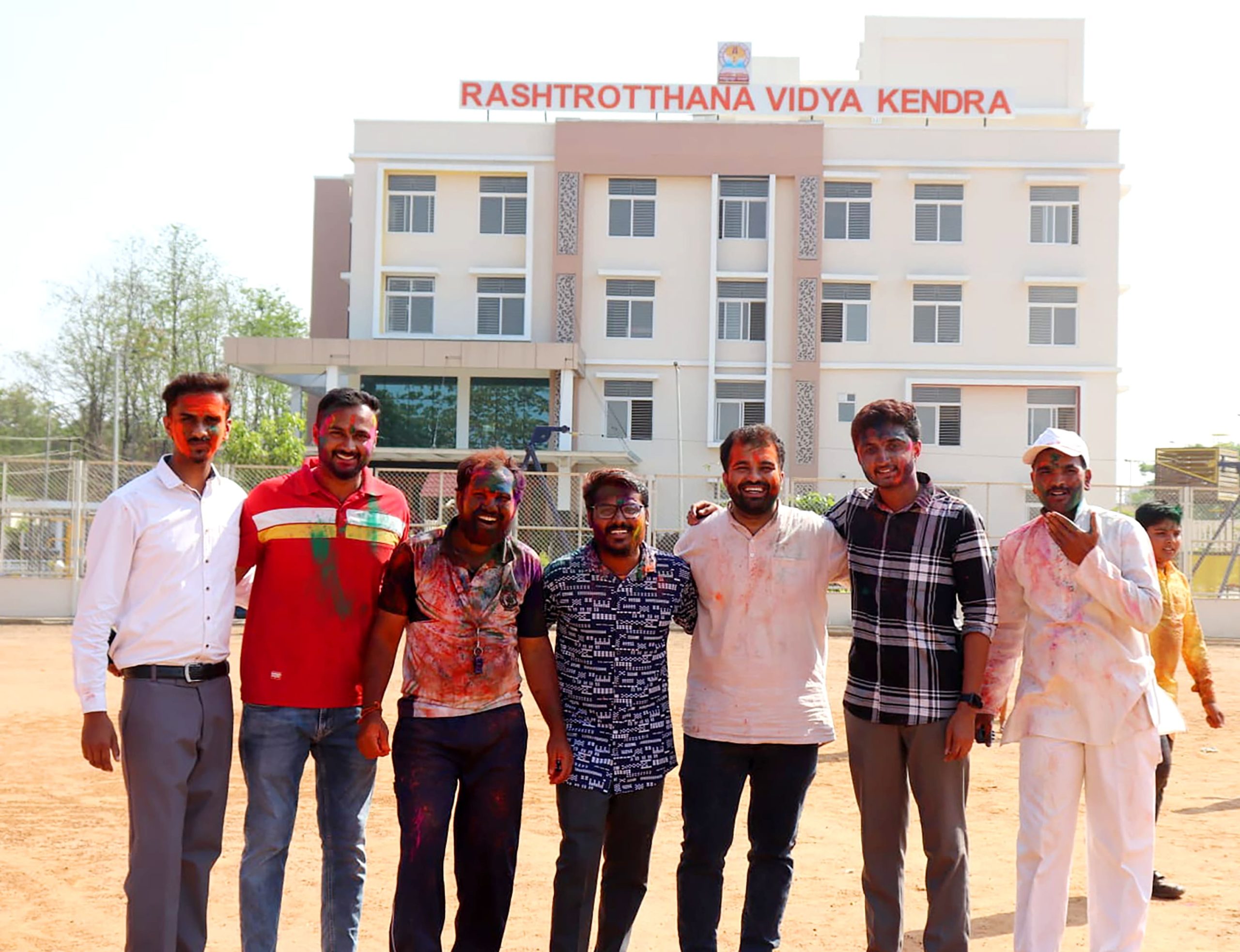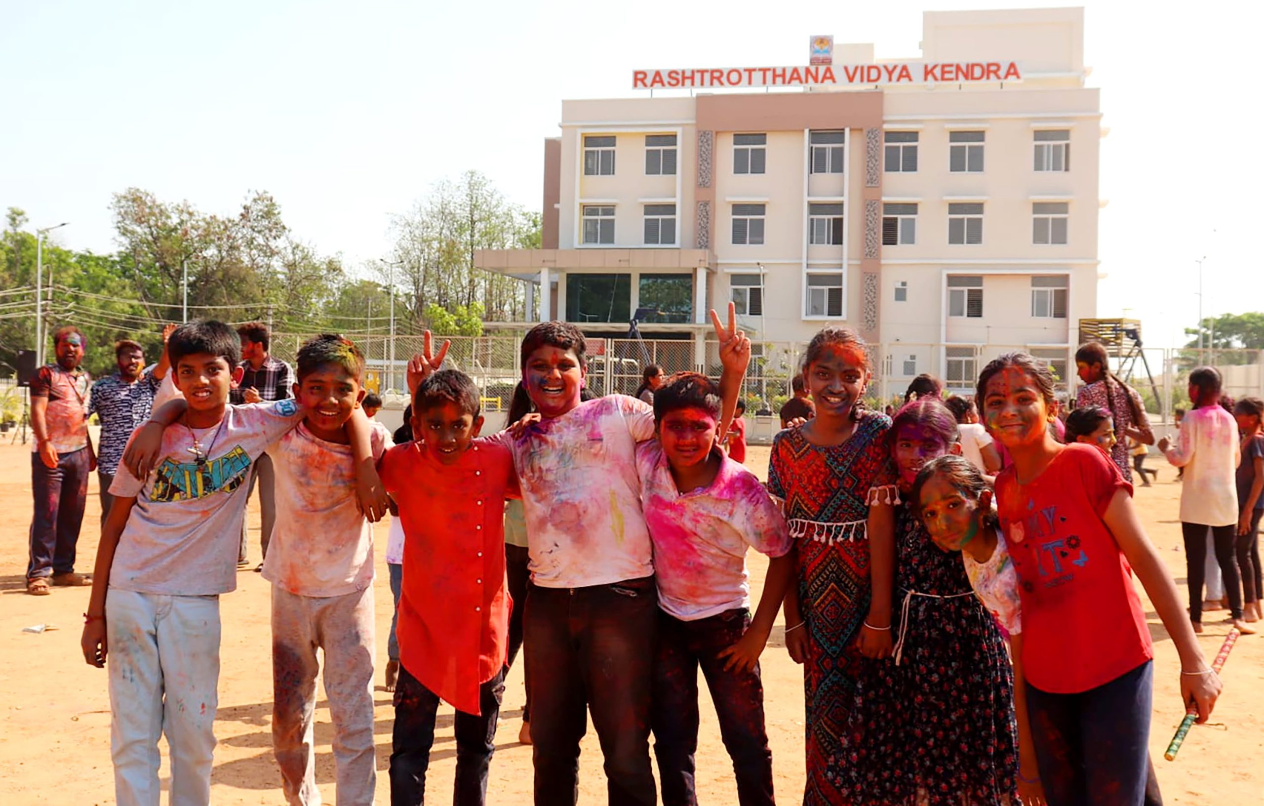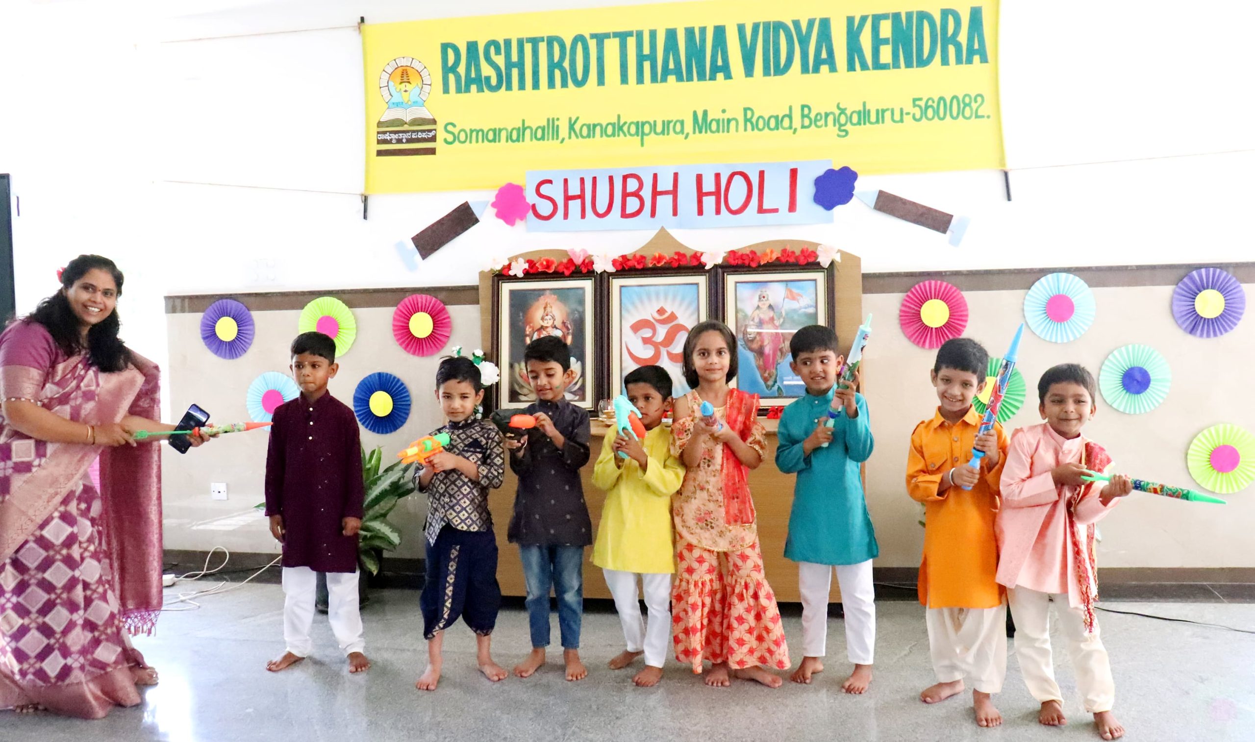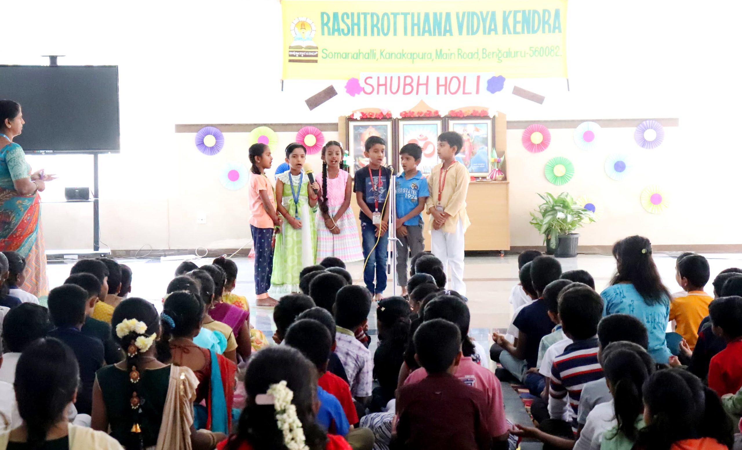 Bengaluru, Mar. 14: Holi festival was celebrated herein Rashtrotthana Vidya Kendra – Somanahalli. The program was inaugurated by Sri Yashwanth, who is in charge of the school administration, by offering puja to Manmatha. Then, the Manmatha was burnt to destroy evil spirits and encourage good deeds. Then, a student of class six gave a detailed background on the celebration of Holi to everyone. Similarly, the students of class three danced on the Holi festival. The principal, Smt. Ramya, offered puja to the pillar. The students of class five and six beat the pot. Finally, everyone applied colours to each other and sang songs and danced.