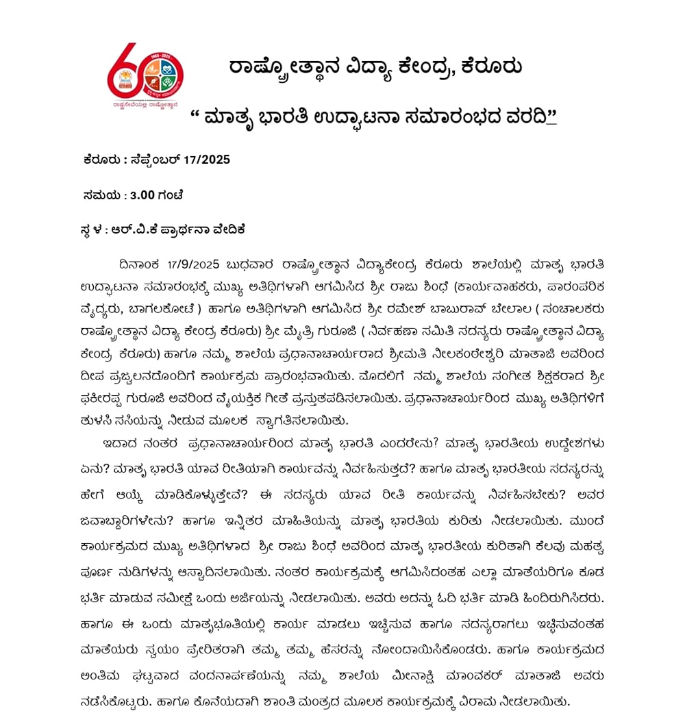 ಬೆಂಗಳೂರು, ಸೆ. 17: ರಾಷ್ಟ್ರೋತ್ಥಾನ ವಿದ್ಯಾಕೇಂದ್ರ – ಸೋಮನಹಳ್ಳಿಯಲ್ಲಿ RP@60 ನಿಮಿತ್ತ ಗಣ್ಯ ವ್ಯಕ್ತಿಗಳೊಂದಿಗೆ ಭೇಟಿಯನ್ನು ನಡೆಸಲಾಯಿತು.