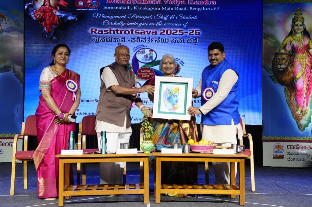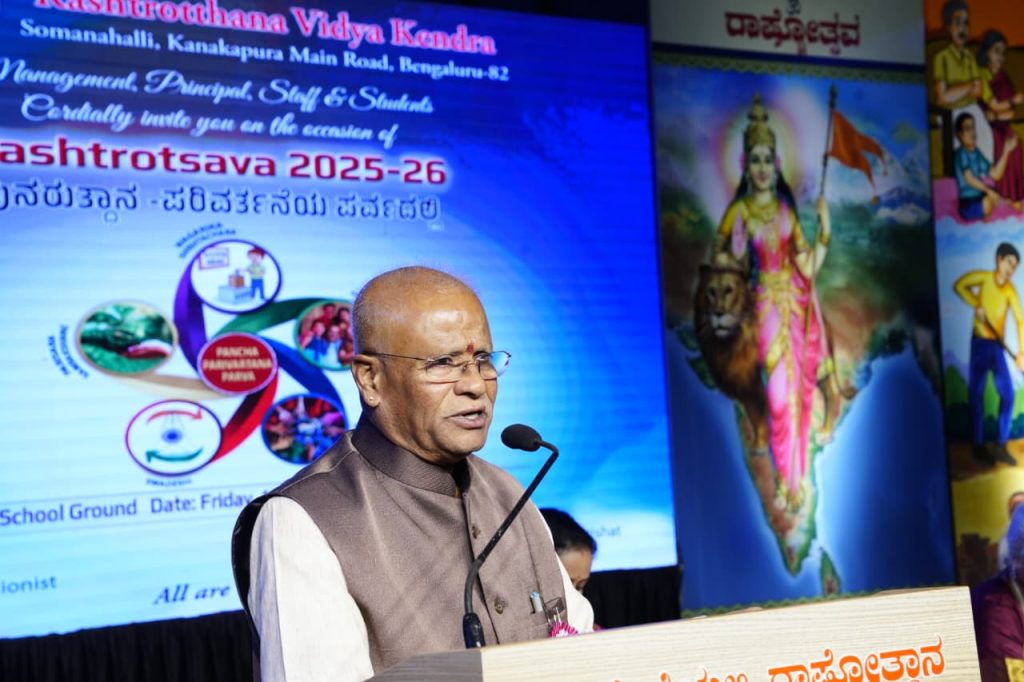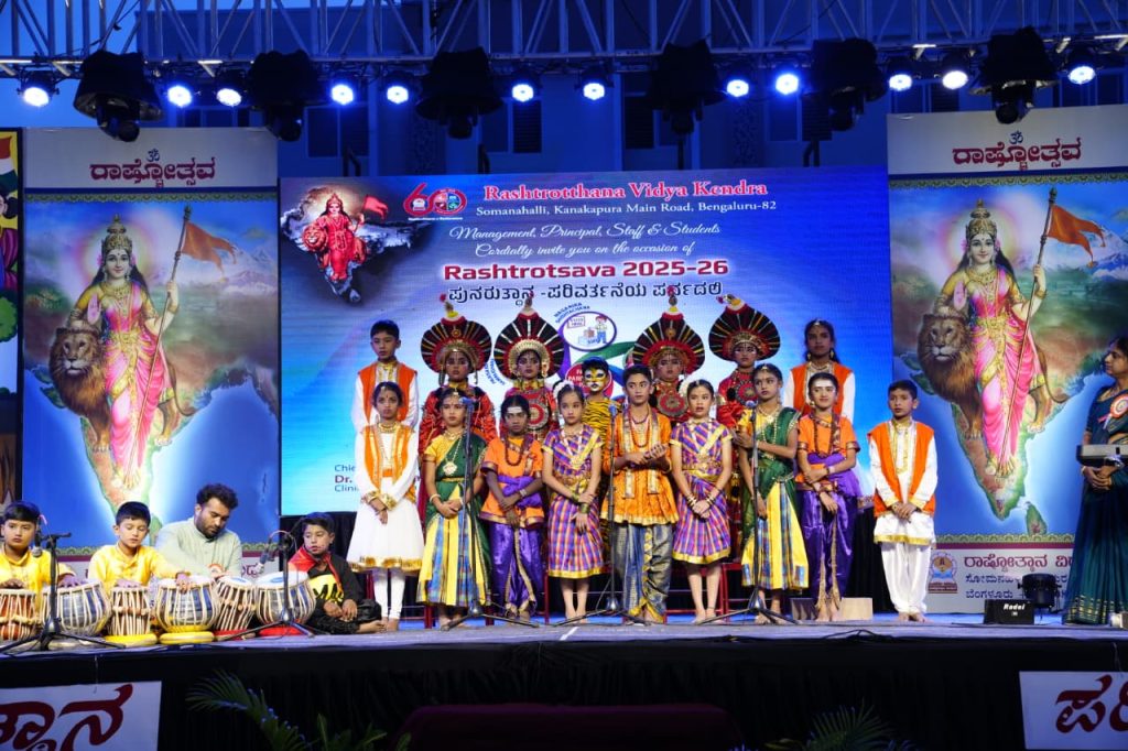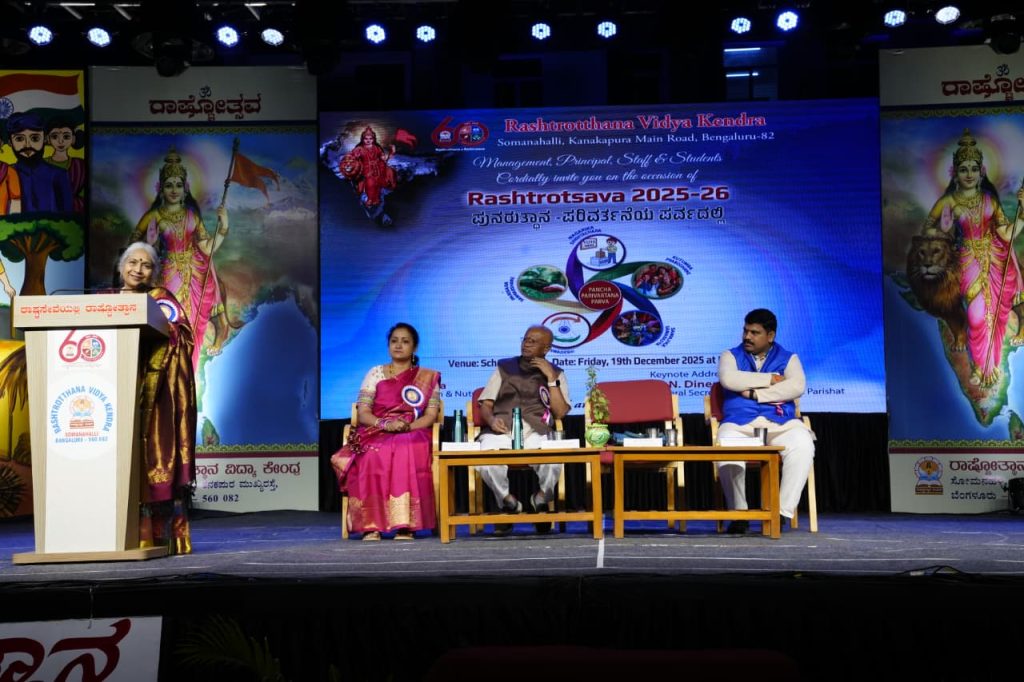 ಬೆಂಗಳೂರು, ಡಿ. 19: ರಾಷ್ಟ್ರೋತ್ಥಾನ ವಿದ್ಯಾಕೇಂದ್ರ- ಸೋಮನಹಳ್ಳಿಯಲ್ಲಿ ʼಪುನರುತ್ಥಾನ – ಪರಿವರ್ತನೆಯ ಪರ್ವತದಲ್ಲಿʼ ವಿಷಯದಡಿಯಲ್ಲಿ 2025–26ರ ಶೈಕ್ಷಣಿಕ ವರ್ಷದ ರಾಷ್ಟ್ರೋತ್ಸವವನ್ನು ಆಚರಿಸಲಾಯಿತು. ಕ್ಲಿನಿಕಲ್ಡ ಯಟೀಷಿಯನ್ ಮತ್ತು ಪೌಷ್ಟಿಕತಜ್ಞರಾದ ಡಾ. ಎಚ್.ಎಸ್. ಪ್ರೇಮಾ ಅವರು ಮುಖ್ಯ ಅತಿಥಿಯಾಗಿ ಭಾಗವಹಿಸಿದ್ದರು. ಮುಖ್ಯ ಅತಿಥಿಗಳು ಪೋಷಕರು ಭಾರತೀಯ ಸಂಸ್ಕಾರವನ್ನು ಎತ್ತಿಹಿಡಿಯಲು ಪ್ರೋತ್ಸಾಹಿಸಿದರು ಮತ್ತು ಪೌಷ್ಟಿಕ ಆಹಾರ ಸಂಸ್ಕೃತಿಯ ಕಡೆಗೆ ಮನಸ್ಥಿತಿಯಲ್ಲಿ ಸಕಾರಾತ್ಮಕ ಬದಲಾವಣೆಯನ್ನು ತರುವ ಅಗತ್ಯವನ್ನು ಒತ್ತಿ ಹೇಳಿದರು. ರಾಷ್ಟ್ರೋತ್ಥಾನ ಪರಿಷತ್ತಿನ ಪ್ರಧಾನ ಕಾರ್ಯದರ್ಶಿ ಶ್ರೀ ನಾ ದಿನೇಶ್ ಹೆಗ್ಡೆ ಅವರು ಎಲ್ಲರೂ RP@60 ಮತ್ತು RSS@100 – ಪಂಚಪರಿವರ್ತನದಲ್ಲಿ ಸಕ್ರಿಯವಾಗಿ ಭಾಗವಹಿಸುವಂತೆ ಪ್ರೇರೇಪಿಸಿದರು ಮತ್ತು ರಾಷ್ಟ್ರೋತ್ಥಾನ ಪರಿಷತ್ತಿನ ವಿವಿಧ ಪ್ರಕಲ್ಪಗಳನ್ನು ಸಹ ಎತ್ತಿ ತೋರಿಸಿದರು. ವಿದ್ಯಾರ್ಥಿಗಳು ಪ್ರಸ್ತುತಪಡಿಸಿದ ಉತ್ತಮವಾಗಿ ಯೋಜಿತ ಸಾಂಸ್ಕೃತಿಕ ಪ್ರದರ್ಶನಗಳ ಸರಣಿಯ ಮೂಲಕ ಪುನರುತ್ಥಾನದ ವಿಷಯವನ್ನು ಪರಿಣಾಮಕಾರಿಯಾಗಿ ತಿಳಿಸಲಾಯಿತು. ನೃತ್ಯಗಳು, ಕಿರುನಾಟಕಗಳು, ಹಾಡುಗಳು ಮತ್ತು ವಿಷಯಾಧಾರಿತ ಪ್ರಸ್ತುತಿಗಳಂತಹ ವಿವಿಧ ಕಾರ್ಯಕ್ರಮಗಳು ಮೌಲ್ಯಗಳು, ಸಂಸ್ಕೃತಿ, ಪರಿಸರ ಜಾಗೃತಿ ಮತ್ತು ಸಾಮಾಜಿಕ ಜವಾಬ್ದಾರಿಯ ಪುನರುಜ್ಜೀವನವನ್ನು ಎತ್ತಿ ತೋರಿಸಿದವು.