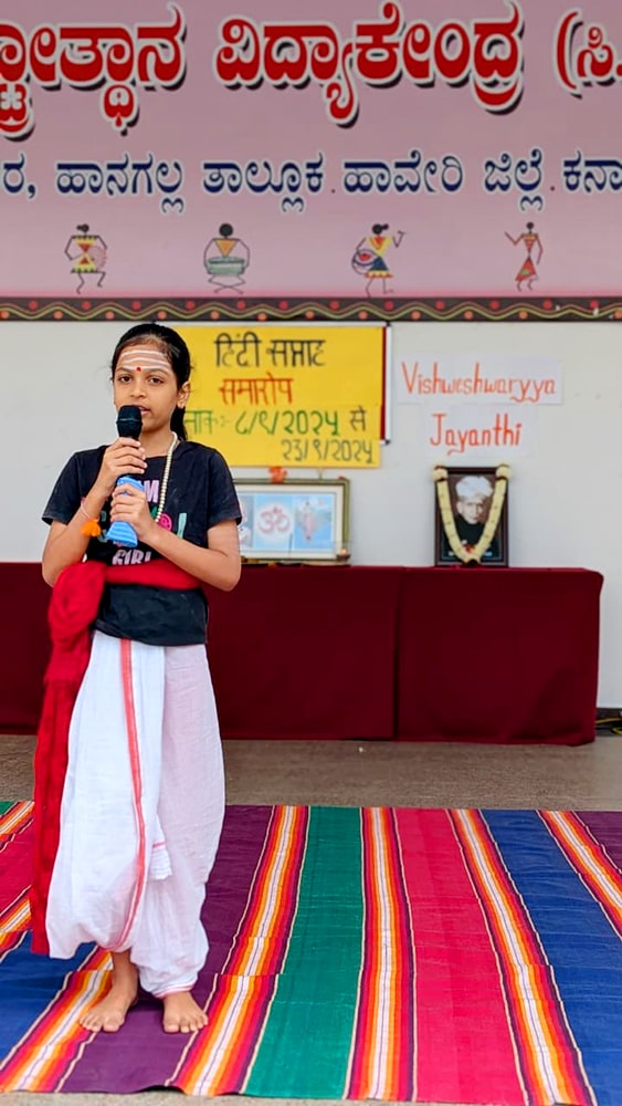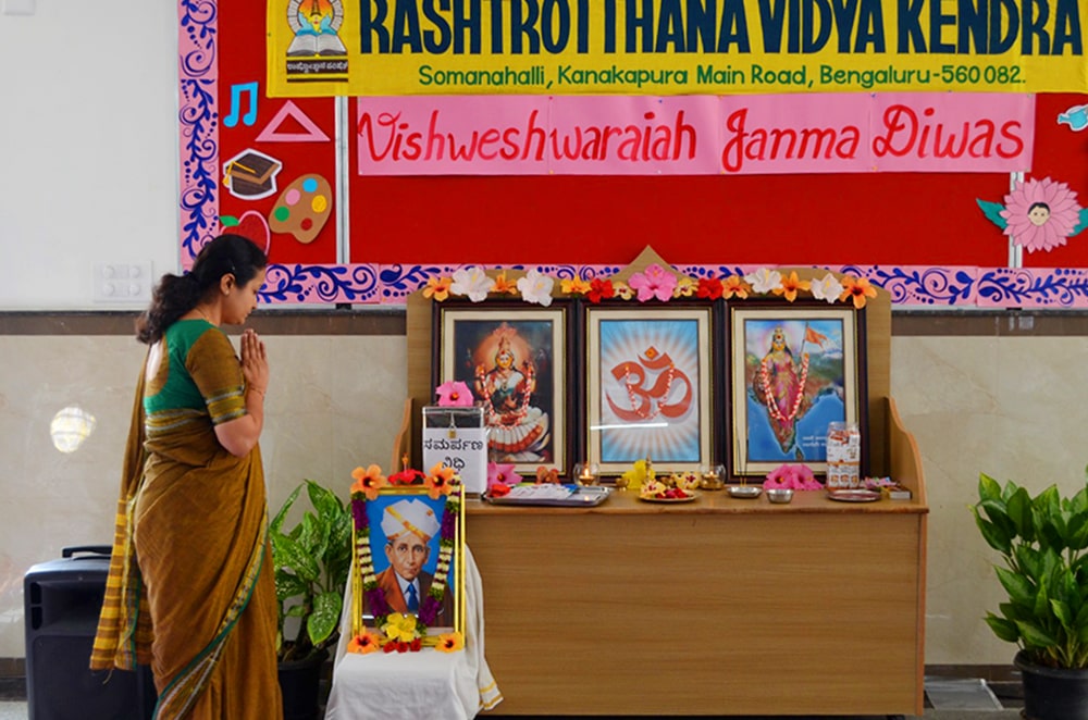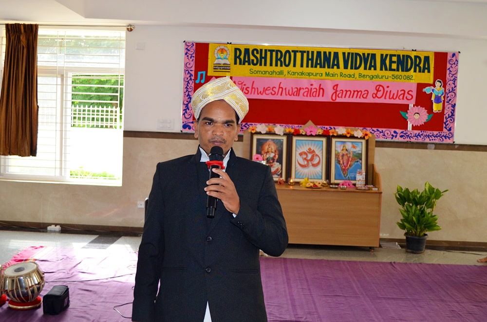Bengaluru, Septt. 15: Sir M. Vishweshwarayya’s birth anniversary was celebrated herein Rashtrotthana Vidya Kendra – Somanahalli. The significance of the day was explained by highlighting his great contributions as an engineer, politician and philosopher. A special Chadmavesha depicting Sir M. Vishweshwarayya with utmost enthusiasm was also presented.