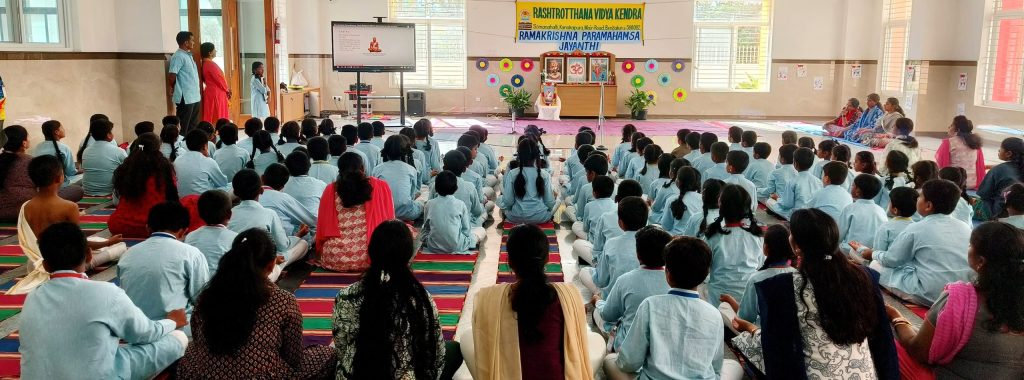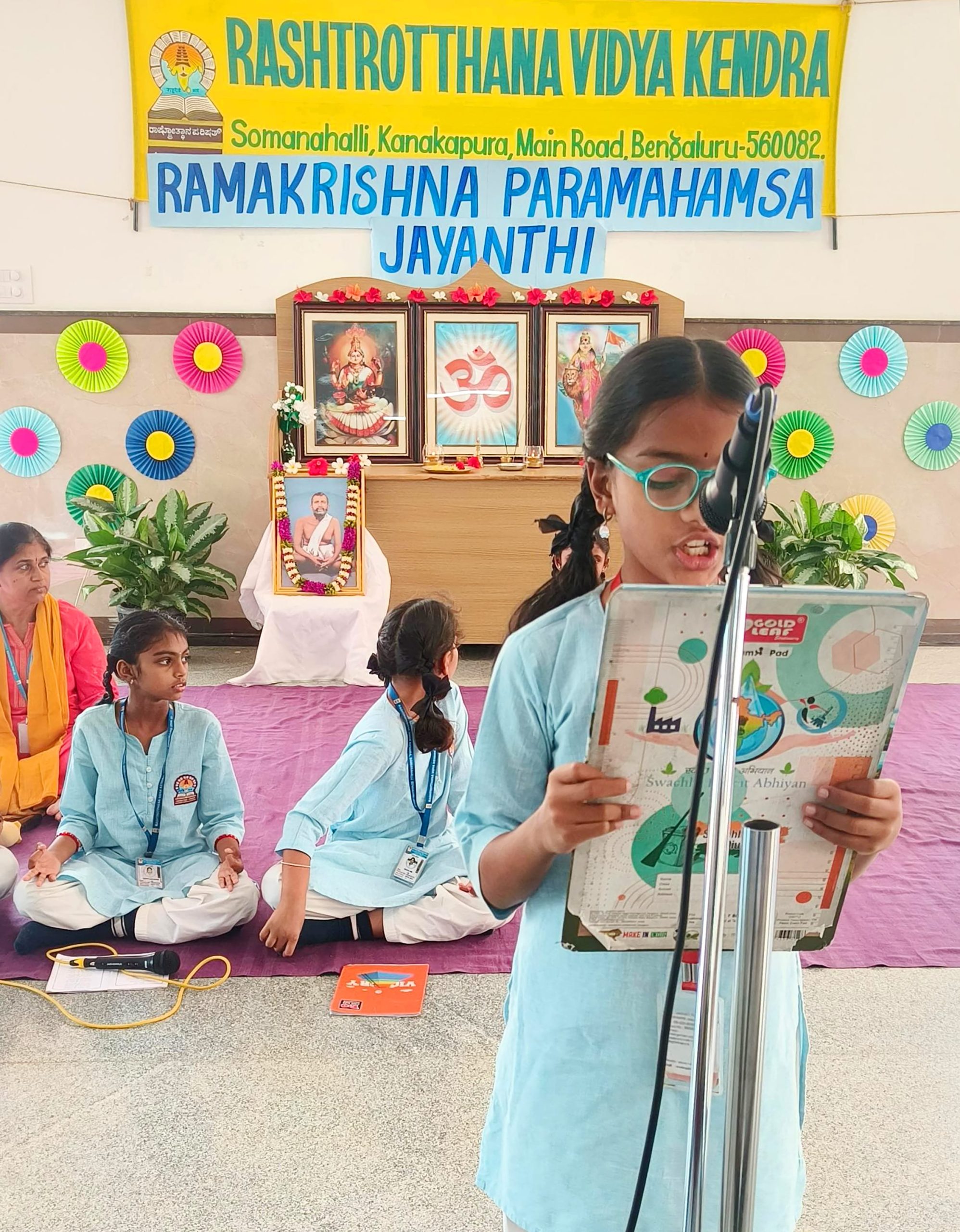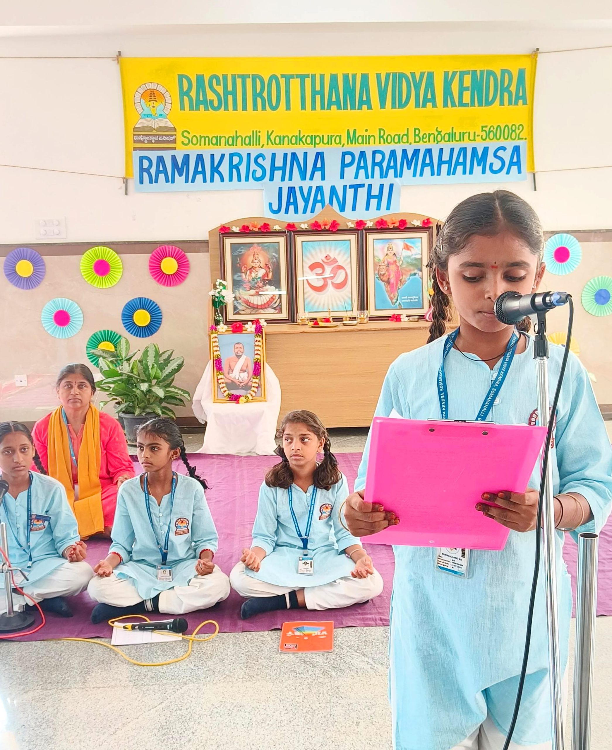 Bengaluru, Mar. 15: Sri Ramakrishna Paramahamsa Jayanti was celebrated herein Rashtrotthana Vidya Kendra – Somanahalli. A student of class 3 delivered a speech highlighting the life, philosophy and teachings of Sri Ramakrishna. A student of class 5 performed a dance performance and recited the words of Sri Ramakrishna Paramahamsa. A documentary video on the life and teachings of Guruji was screened.