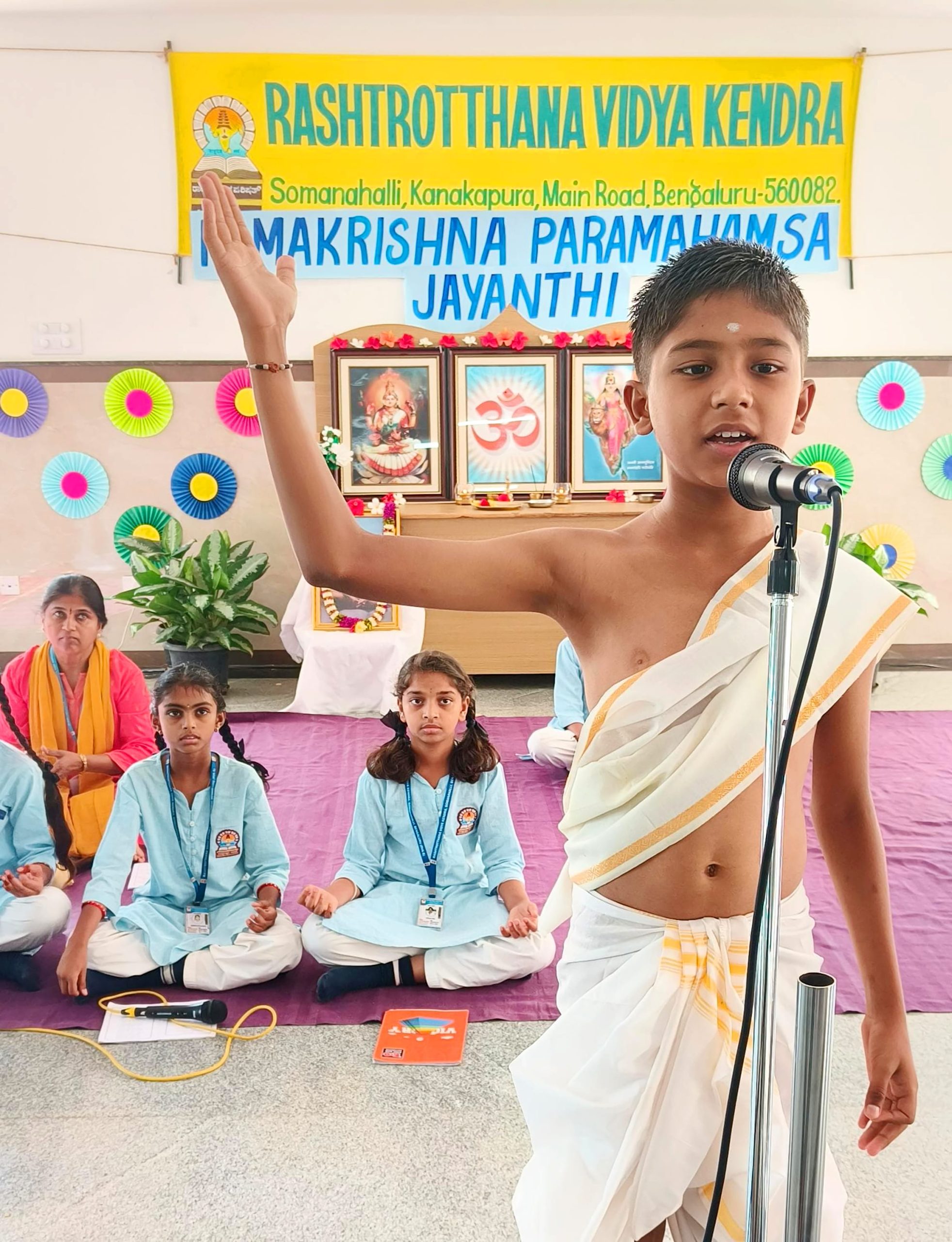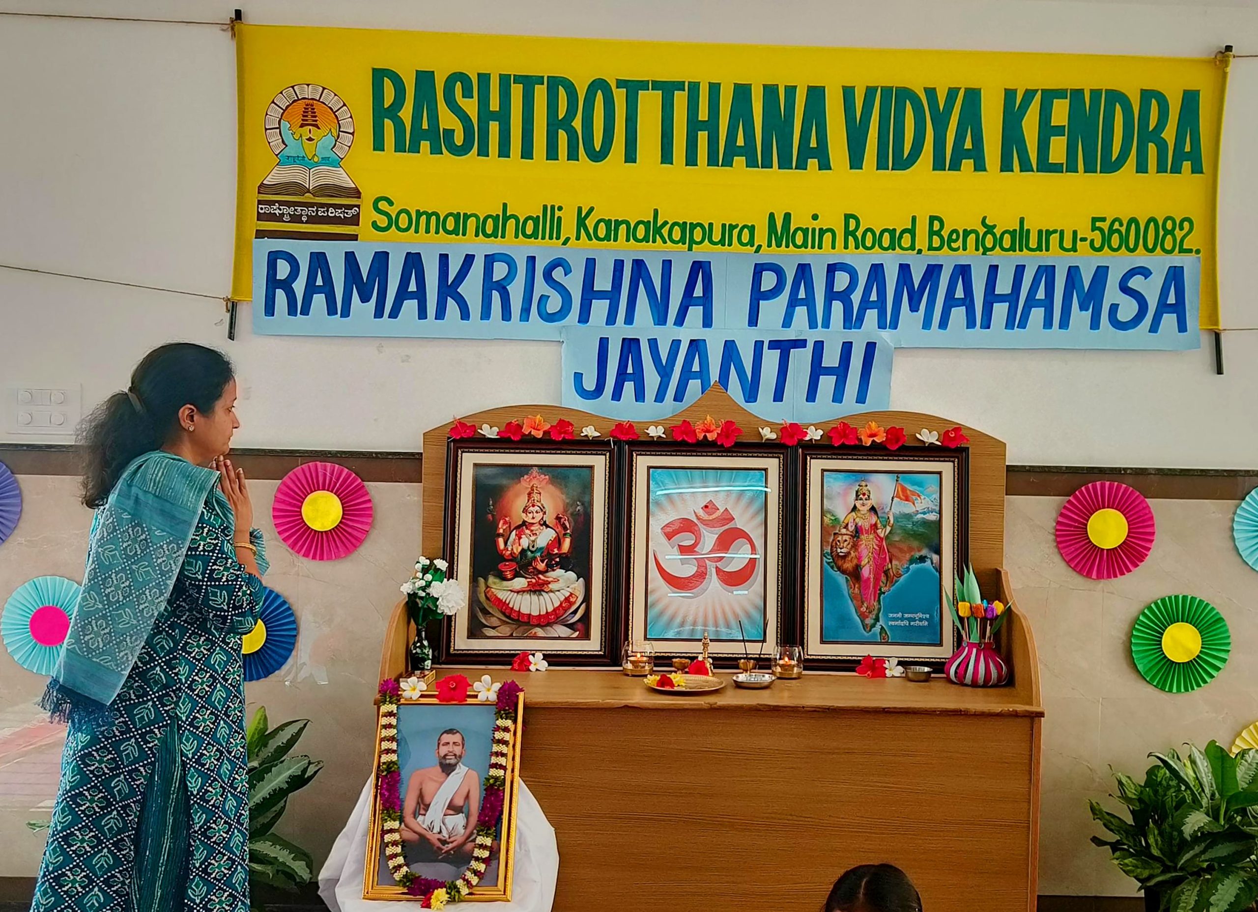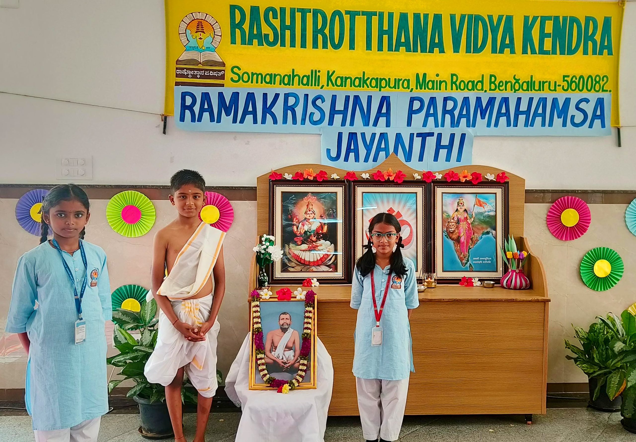 Bengaluru, Mar. 15: Sri Ramakrishna Paramahamsa Jayanti was celebrated herein Rashtrotthana Vidya Kendra – Somanahalli. A student of class 3 delivered a speech highlighting the life, philosophy and teachings of Sri Ramakrishna. A student of class 5 performed a dance performance and recited the words of Sri Ramakrishna Paramahamsa. A documentary video on the life and teachings of Guruji was screened.