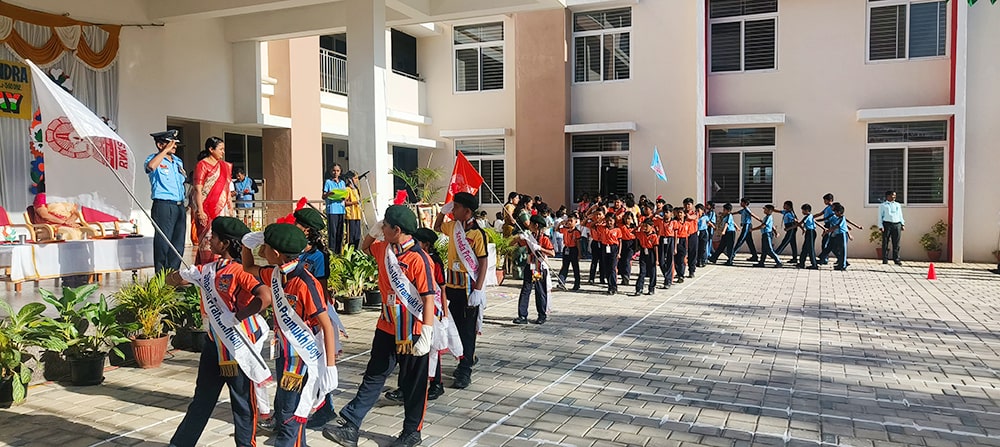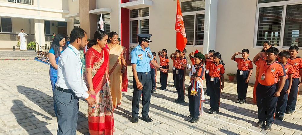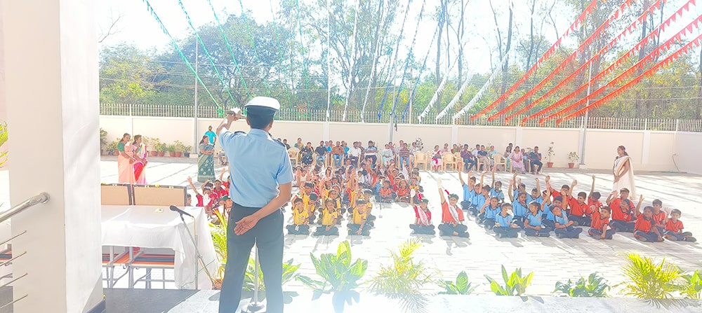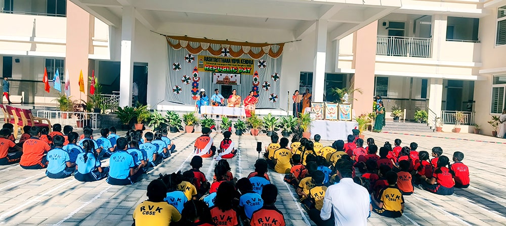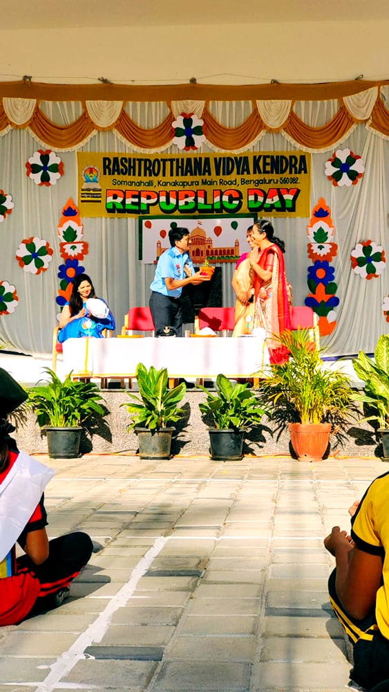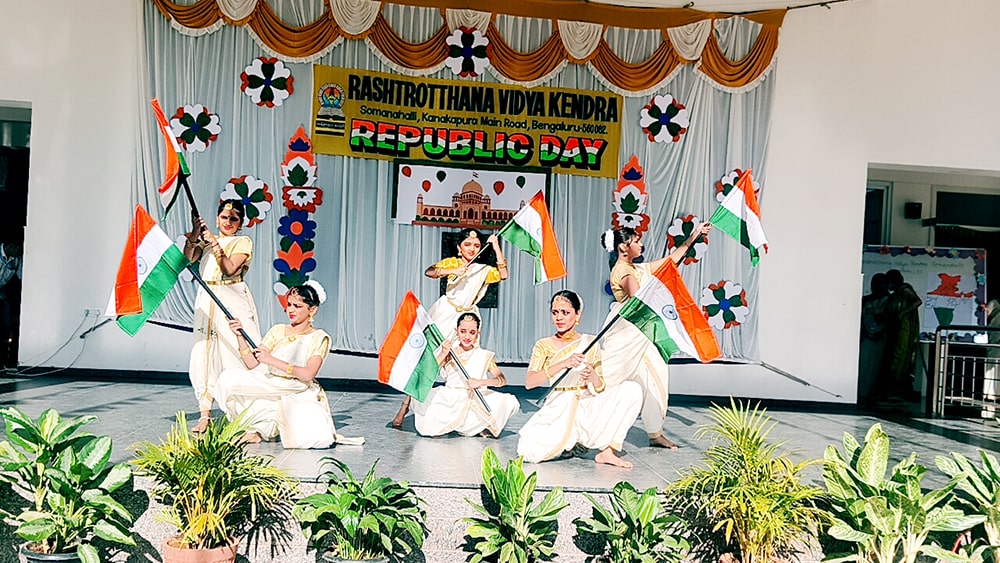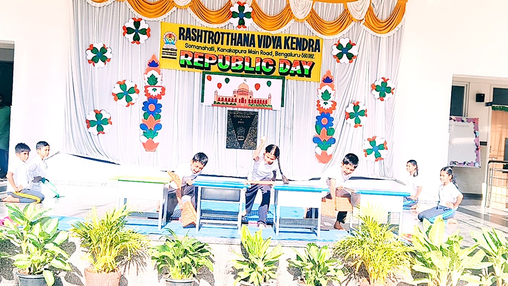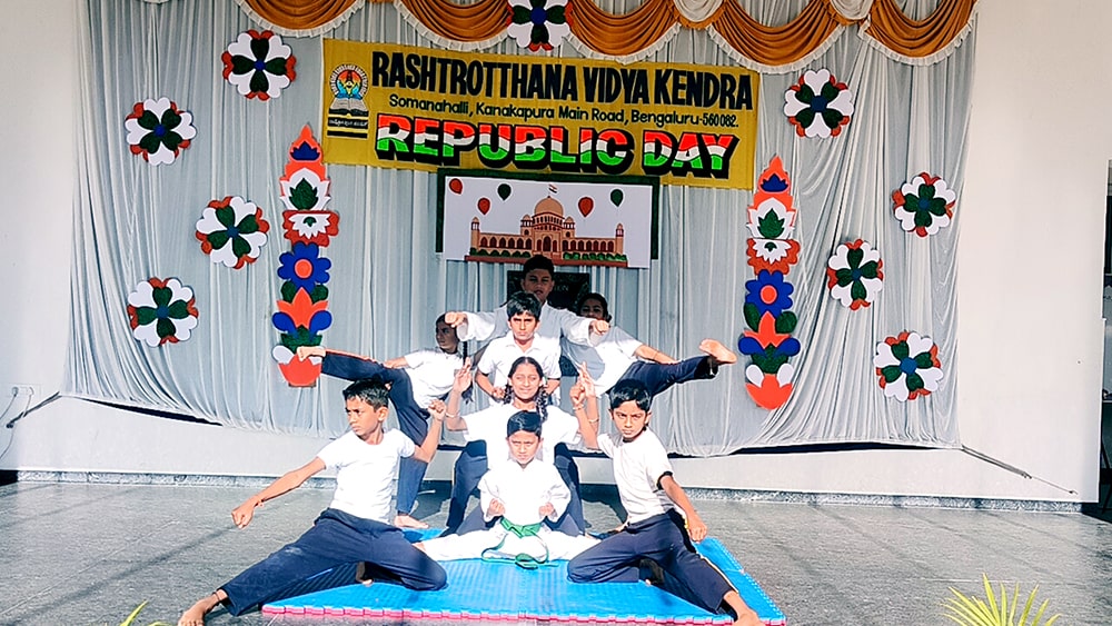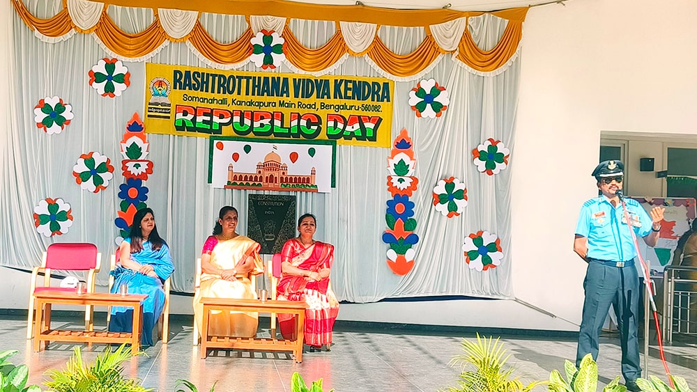 Bengaluru, Jan. 26: The 76th Republic Day was celebrated herein Rashtrotthana Vidya Kendra – Somanahalli. Group Captain, Air Force, Sri Udaya Ravi was the chief guest. The National Anthem was sung along with the hoisting of the National Flag. Group Captain Sri Udaya Ravi asked the students to uphold the values ​​of the Constitution and motivated the children to join the Indian Army. A procession was taken out by various student contingents. Students from classes 3 to 6 performed karate. A dance performance depicting the cultural diversity of India was held. A mini-drama (Vyakti Nirman, Rashtra Nirman) highlighting the importance of nation building through citizens was performed.